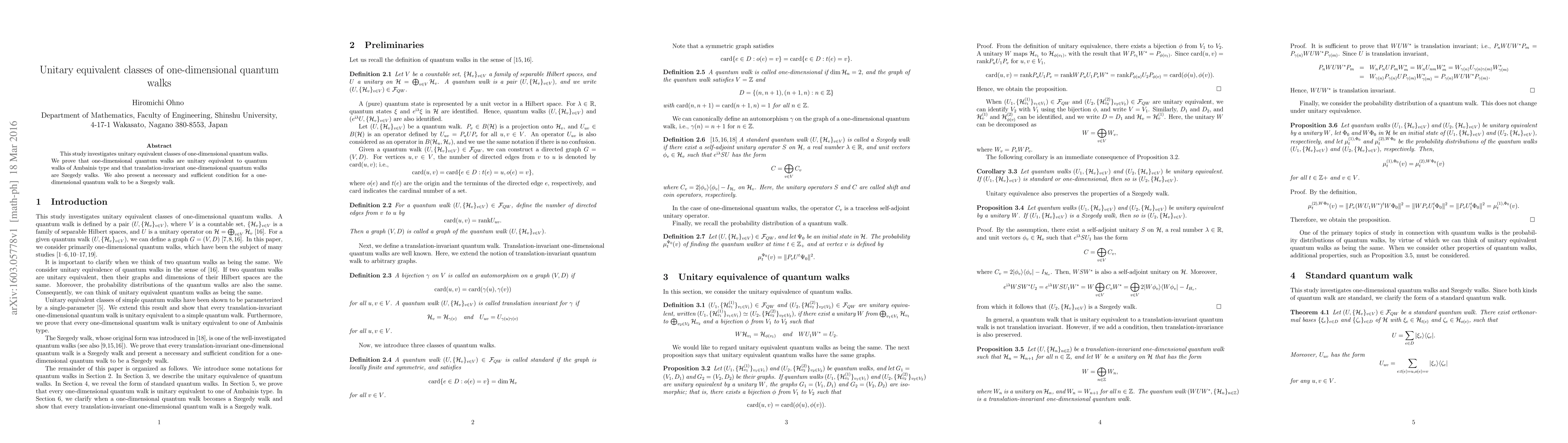 The study investigates unitary equivalent classes of one-dimensional quantum walks, proving their equivalence to Ambainis-type quantum walks and translation-invariant walks to Szegedy walks. It also provides a necessary and sufficient condition for a one-dimensional quantum walk to be a Szegedy walk.