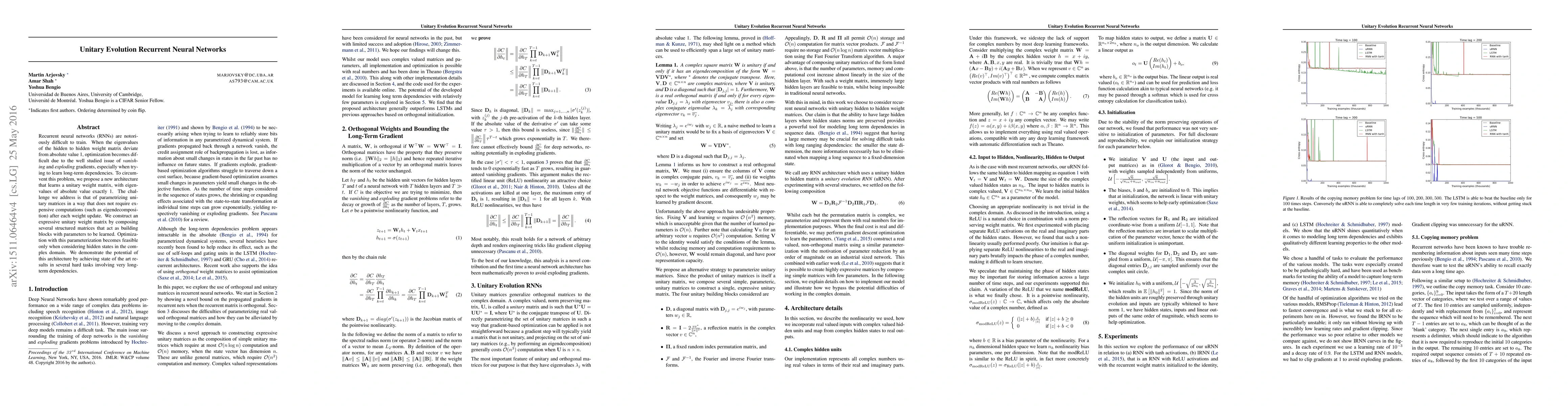 This paper proposes a new RNN architecture that learns unitary weight matrices to address the vanishing and exploding gradient problem, especially for long-term dependencies. The authors introduce a parameterization method for unitary matrices that avoids costly computations, enabling effective optimization and achieving state-of-the-art results in tasks requiring long-term memory.