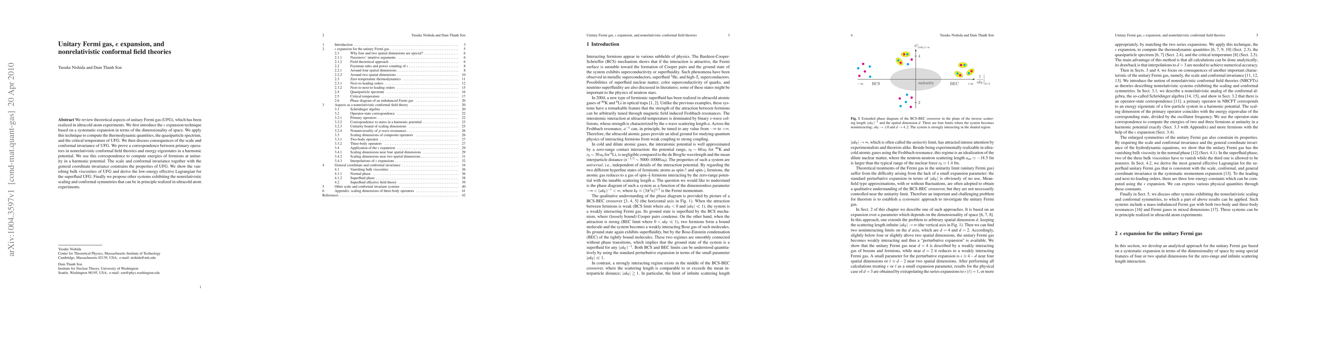 This paper reviews theoretical aspects of unitary Fermi gas (UFG) using the epsilon expansion technique to compute thermodynamic quantities and quasiparticle spectrum, and discusses scale and conformal invariance leading to a low-energy effective Lagrangian. It establishes a correspondence between nonrelativistic conformal field theories and UFG in a harmonic potential.