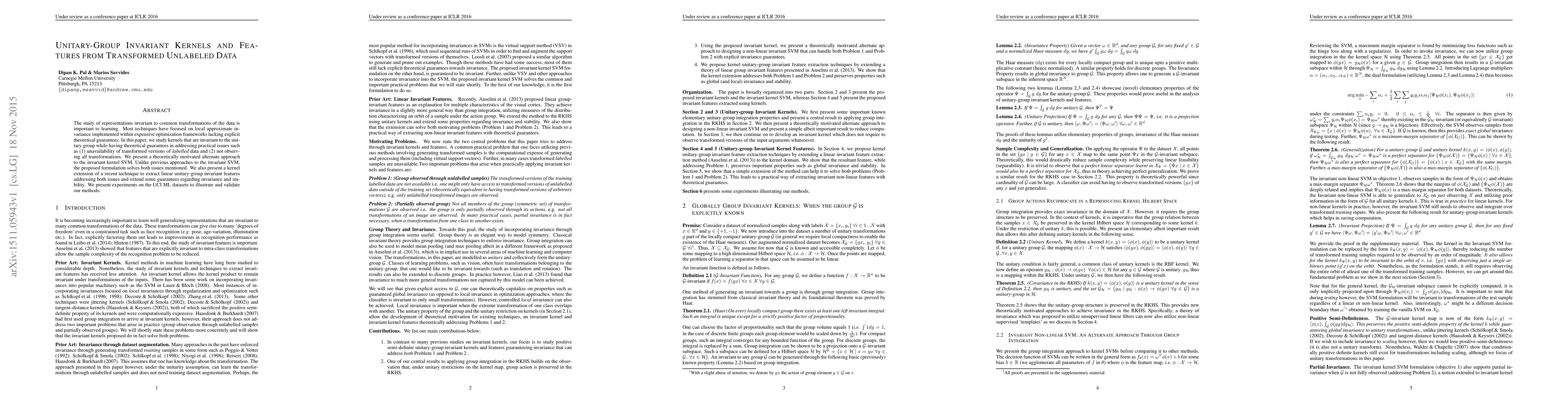 The study of representations invariant to common transformations of the data is important to learning. Most techniques have focused on local approximate invariance implemented within expensive optimization frameworks lacking explicit theoretical guarantees. In this paper, we study kernels that are invariant to the unitary group while having theoretical guarantees in addressing practical issues such as (1) unavailability of transformed versions of labelled data and (2) not observing all transformations. We present a theoretically motivated alternate approach to the invariant kernel SVM. Unlike previous approaches to the invariant SVM, the proposed formulation solves both issues mentioned. We also present a kernel extension of a recent technique to extract linear unitary-group invariant features addressing both issues and extend some guarantees regarding invariance and stability. We present experiments on the UCI ML datasets to illustrate and validate our methods.