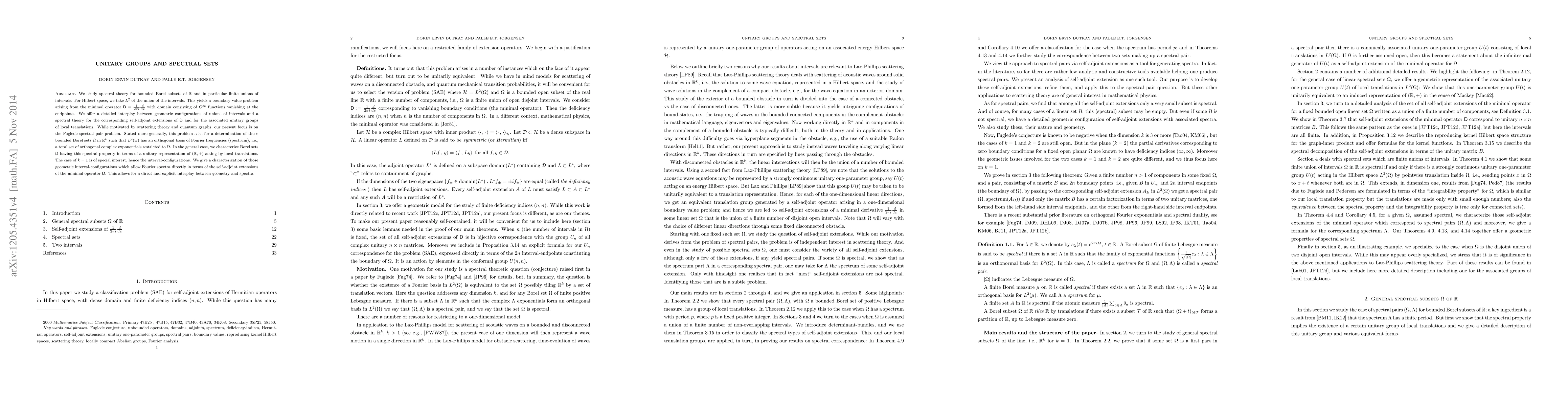 We study spectral theory for bounded Borel subsets of $\br$ and in particular finite unions of intervals. For Hilbert space, we take $L^2$ of the union of the intervals. This yields a boundary value problem arising from the minimal operator $\Ds = \frac1{2\pi i}\frac{d}{dx}$ with domain consisting of $C^\infty$ functions vanishing at the endpoints. We offer a detailed interplay between geometric configurations of unions of intervals and a spectral theory for the corresponding selfadjoint extensions of $\Ds$ and for the associated unitary groups of local translations. While motivated by scattering theory and quantum graphs, our present focus is on the Fuglede-spectral pair problem. Stated more generally, this problem asks for a determination of those bounded Borel sets $\Omega$ in $\br^k$ such that $L^2(\Omega)$ has an orthogonal basis of Fourier frequencies (spectrum), i.e., a total set of orthogonal complex exponentials restricted to $\Omega$. In the general case, we characterize Borel sets $\Omega$ having this spectral property in terms of a unitary representation of $(\br, +)$ acting by local translations. The case of $k = 1$ is of special interest, hence the interval-configurations. We give a characterization of those geometric interval-configurations which allow Fourier spectra directly in terms of the selfadjoint extensions of the minimal operator $\Ds$. This allows for a direct and explicit interplay between geometry and spectra. As an application, we offer a new look at the Universal Tiling Conjecture and show that the spectral-implies-tile part of the Fuglede conjecture is equivalent to it and can be reduced to a variant of the Fuglede conjecture for unions of integer intervals.