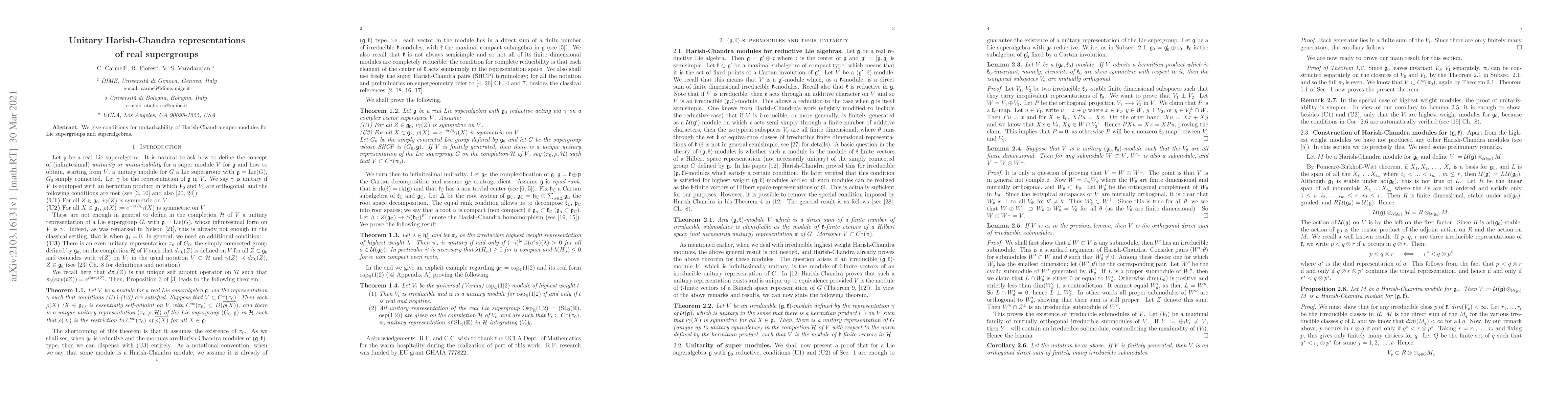 We give conditions for unitarizability of Harish-Chandra super modules for Lie supergroups and superalgebras.