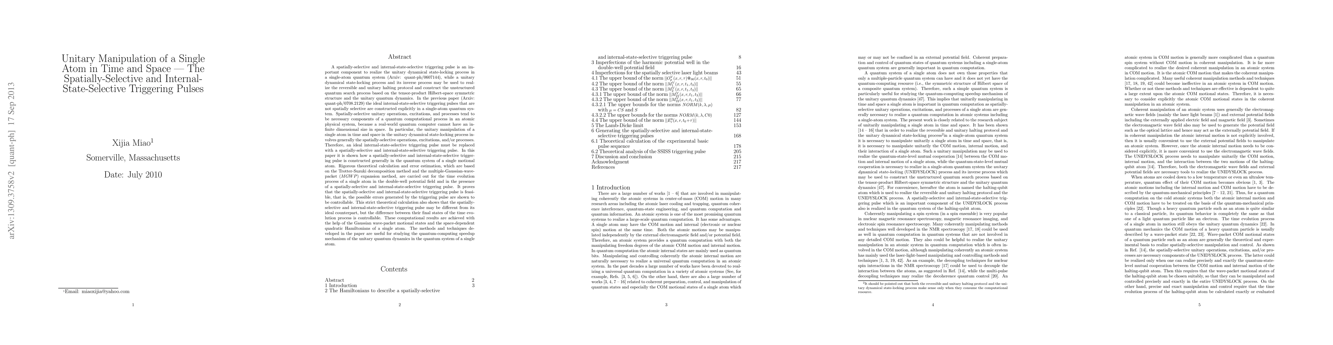 This paper constructs a spatially-selective and internal-state-selective triggering pulse for a single atom, demonstrating its feasibility through rigorous theoretical calculations based on the Trotter-Suzuki decomposition and multiple-Gaussian-wave-packet expansion methods. The study shows that the pulse's errors are controllable and its effects are comparable to ideal pulses, providing insights for quantum computing speedup mechanisms.