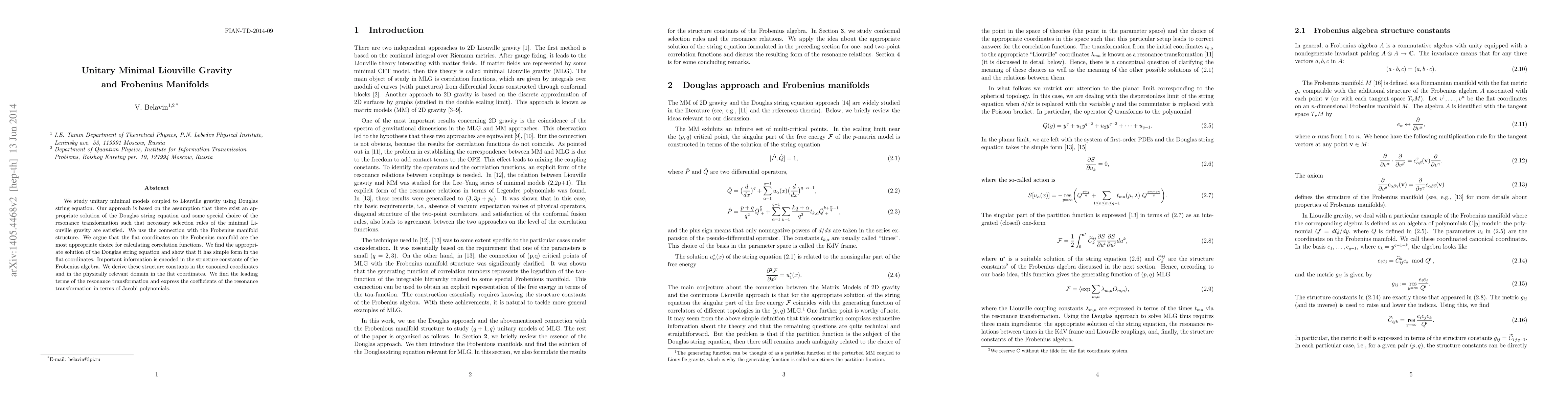 We study unitary minimal models coupled to Liouville gravity using Douglas string equation. Our approach is based on the assumption that there exist an appropriate solution of the Douglas string equation and some special choice of the resonance transformation such that necessary selection rules of the minimal Liouville gravity are satisfied. We use the connection with the Frobenius manifold structure. We argue that the flat coordinates on the Frobenius manifold are the most appropriate choice for calculating correlation functions. We find the appropriate solution of the Douglas string equation and show that it has simple form in the flat coordinates. Important information is encoded in the structure constants of the Frobenius algebra. We derive these structure constants in the canonical coordinates and in the physically relevant domain in the flat coordinates. We find the leading terms of the resonance transformation and express the coefficients of the resonance transformation in terms of Jacobi polynomials.