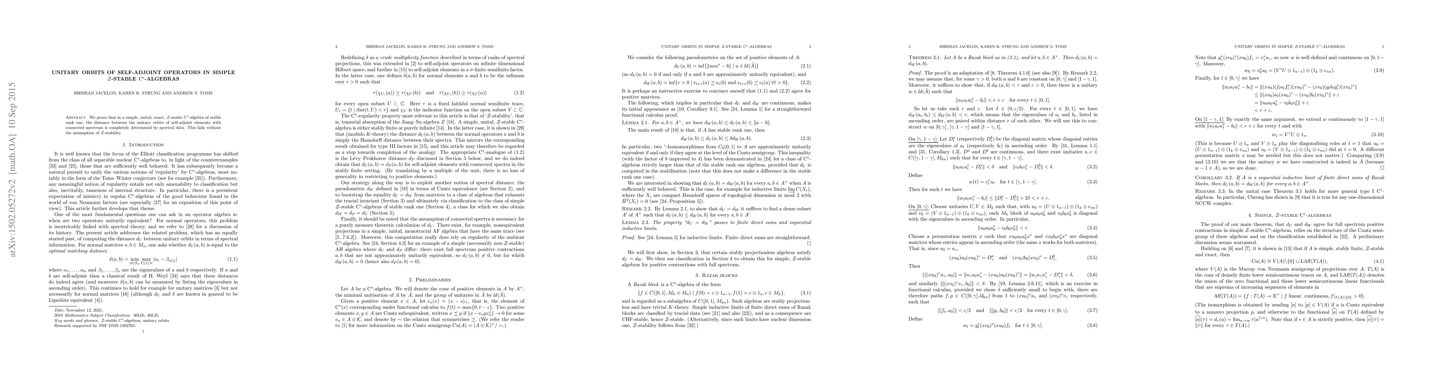 Summary: In simple, unital, exact, Z-stable C*-algebras of stable rank one, the unitary orbits of self-adjoint elements with connected spectrum are fully determined by spectral data; this property does not hold without the Z-stability assumption.
