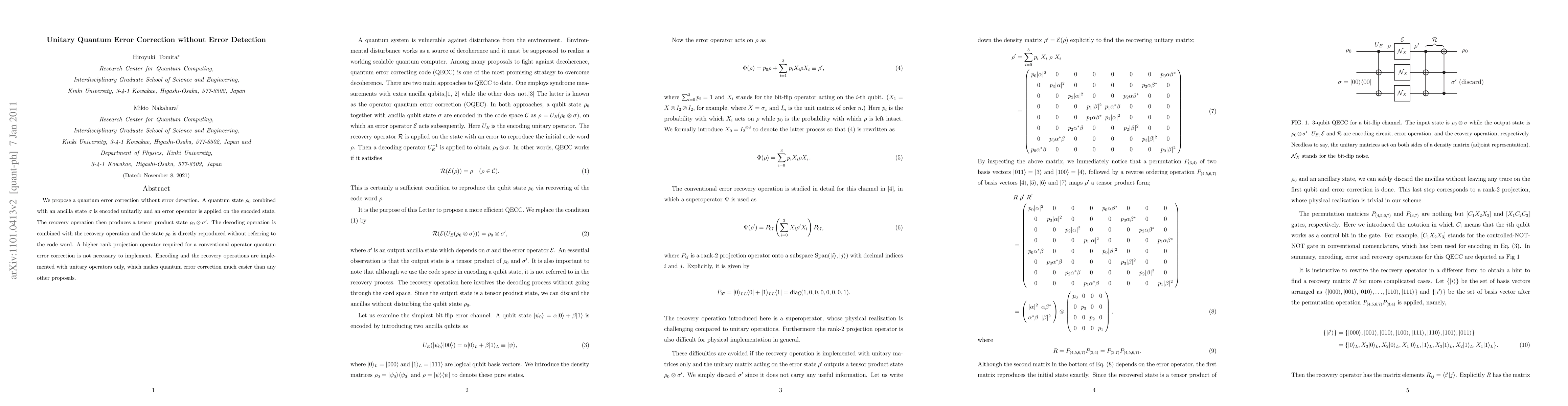 This paper proposes a novel unitary quantum error correction method that does not require error detection. It encodes a quantum state using a unitary transformation combined with an ancilla state, applies an error operator, and recovers the original state without referencing the code word, simplifying the process compared to conventional methods.