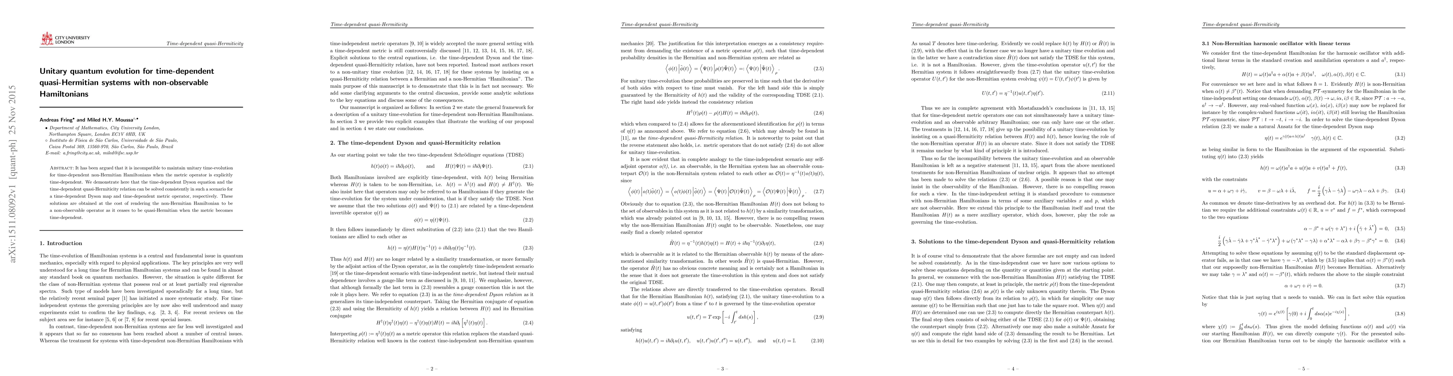 This paper demonstrates that unitary quantum evolution can be maintained for time-dependent quasi-Hermitian systems with non-observable Hamiltonians by solving the time-dependent Dyson equation and quasi-Hermiticity relation consistently, albeit at the expense of the Hamiltonian no longer being quasi-Hermitian when the metric operator varies with time.