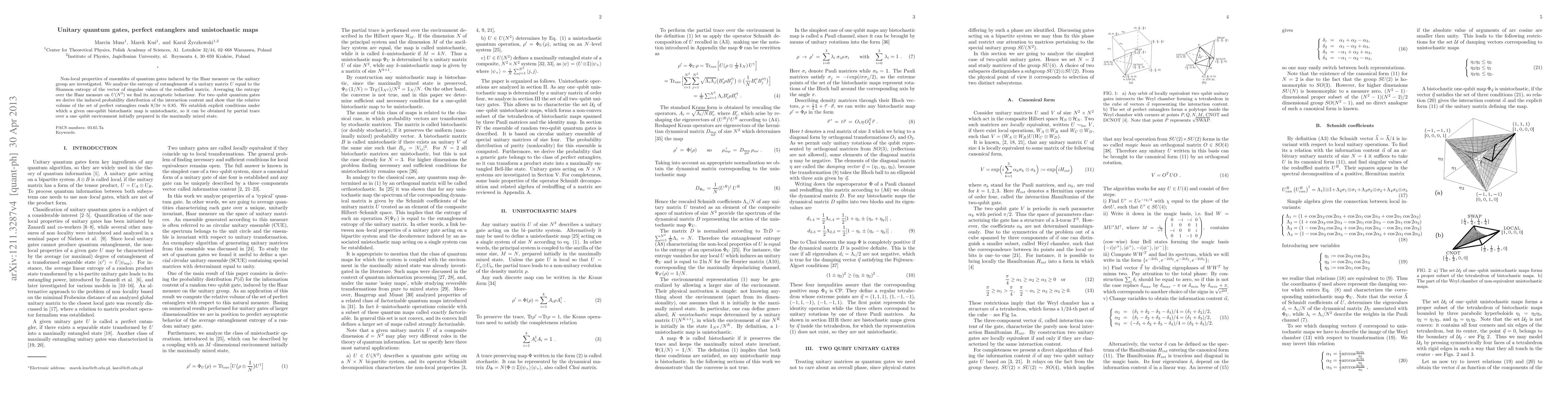 This paper investigates the non-local properties of quantum gates via the Haar measure on the unitary group, focusing on the entropy of entanglement. It finds the asymptotic behavior of entanglement entropy for unitary matrices and determines the probability distribution of interaction content for two-qubit gates, revealing that perfect entanglers occupy approximately 0.85 of this space. Additionally, it establishes conditions for a one-qubit bistochastic map to be unistochastic through partial trace over a maximally mixed environment.
