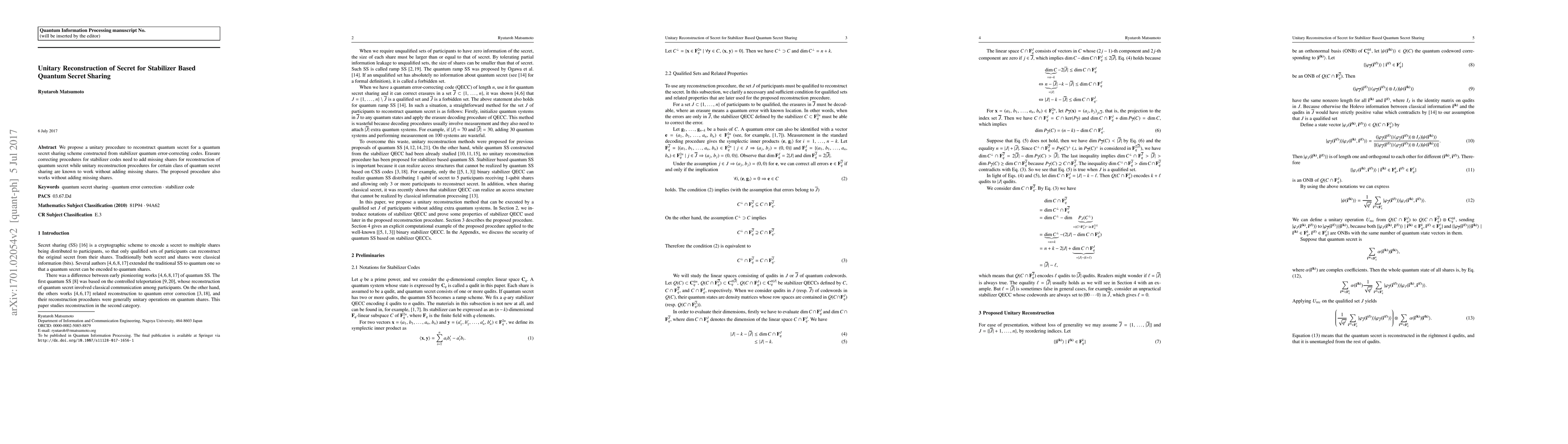 This paper proposes a unitary reconstruction method for quantum secret sharing schemes based on stabilizer quantum error-correcting codes, which allows for the recovery of the secret without needing to add missing shares, unlike traditional erasure correcting procedures.