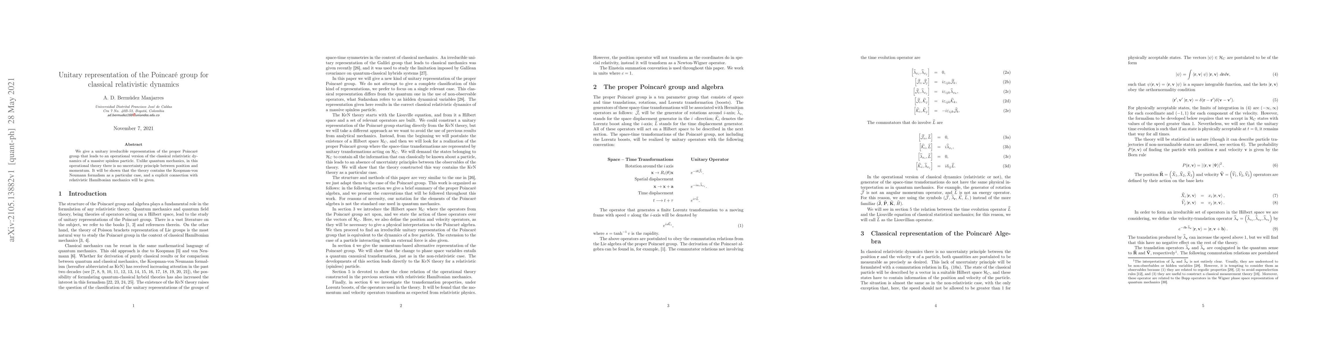 This paper presents a unitary irreducible representation of the Poincaré group that defines a classical relativistic dynamics for a massive spinless particle, without the uncertainty principle between position and momentum. It also connects this operational theory to the Koopman-von Neumann formalism and relativistic Hamiltonian mechanics.