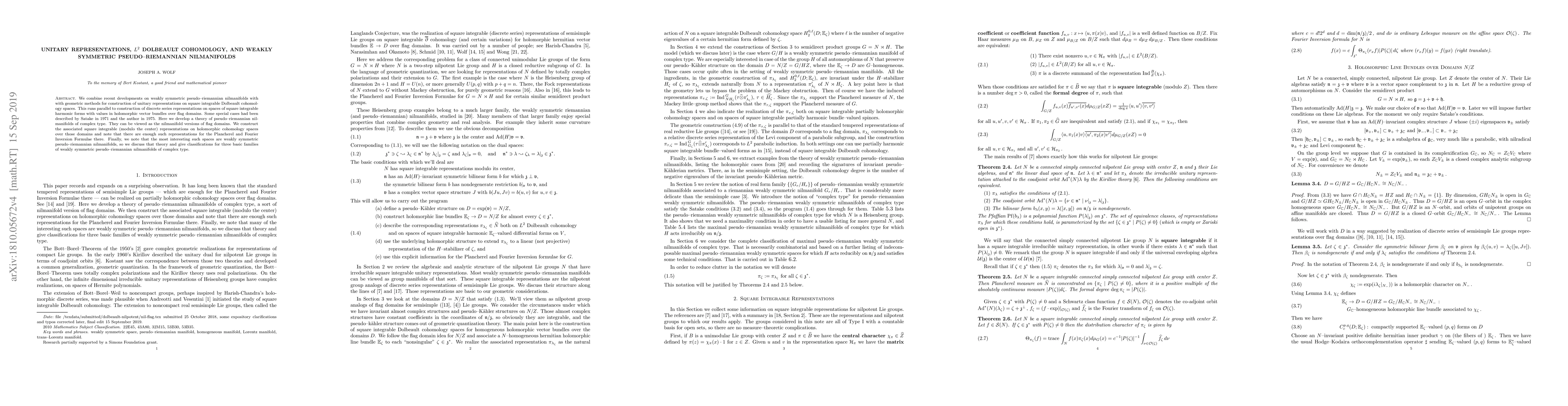 We combine recent developments on weakly symmetric pseudo--riemannian nilmanifolds with with geometric methods for construction of unitary representations on square integrable Dolbeault cohomology spaces. This runs parallel to construction of discrete series representations on spaces of square integrable harmonic forms with values in holomorphic vector bundles over flag domains. Some special cases had been described by Satake in 1971 and the author in 1975. Here we develop a theory of pseudo--riemannian nilmanifolds of complex type and the nilmanifold versions of flag domains. We construct the associated square integrable (modulo the center) representations on holomorphic cohomology spaces over those domains and note that there are enough such representations for the Plancherel and Fourier Inversion Formulae there. Finally, we note that the most interesting such spaces are weakly symmetric pseudo-riemannian nilmanifolds, so we discuss that theory and give classifications for three basic families of weakly symmetric pseudo--riemannian nilmanifolds of complex type.