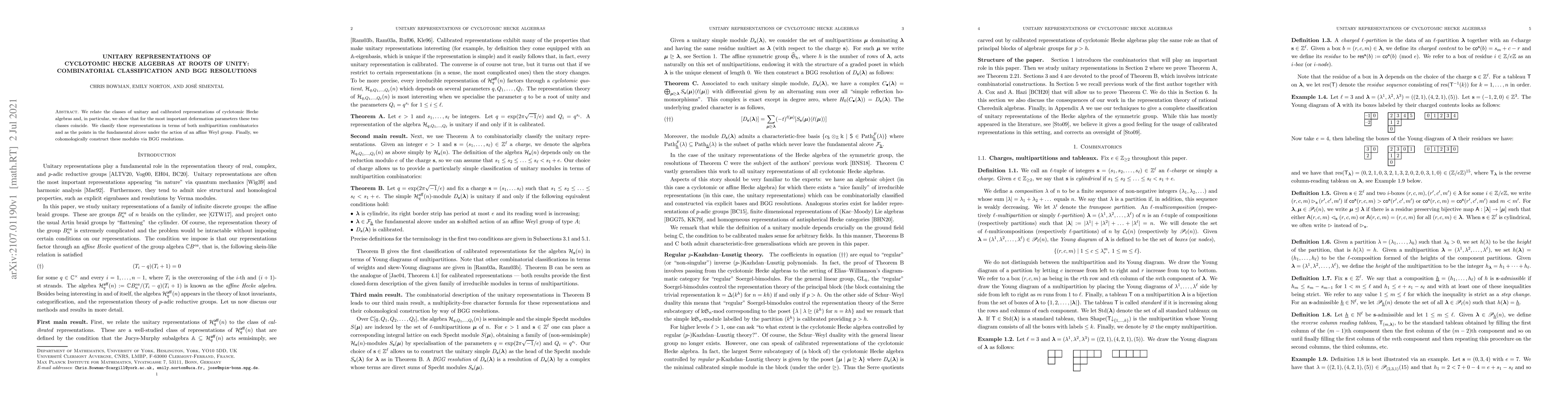 This paper establishes a combinatorial classification of unitary representations of cyclotomic Hecke algebras at roots of unity, showing their equivalence to calibrated representations for key deformation parameters. It utilizes multipartition combinatorics and affine Weyl group actions, and constructs these modules via BGG resolutions.