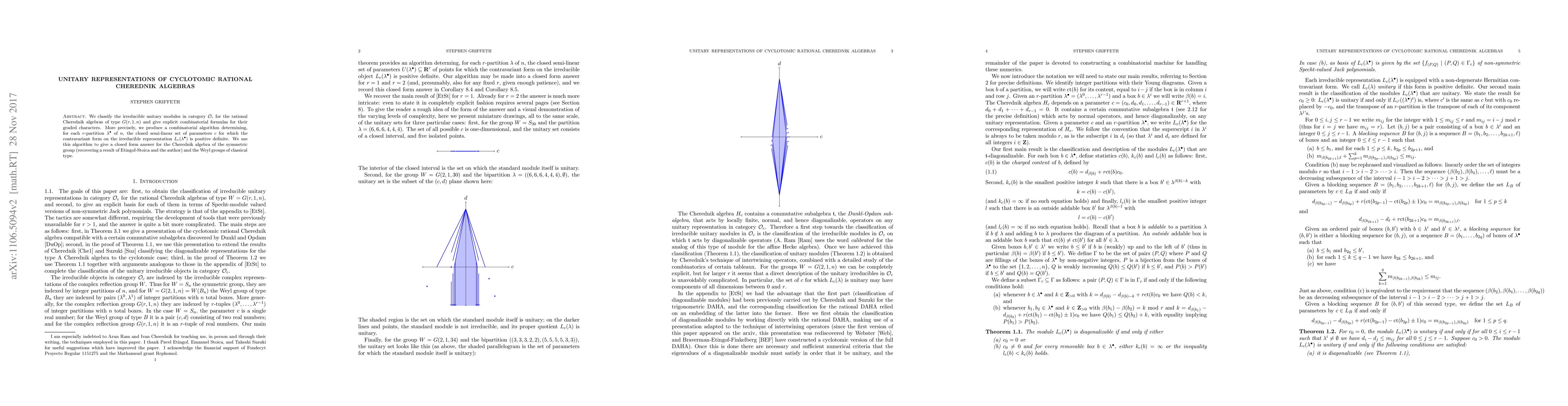 This paper classifies irreducible unitary modules in category O for cyclotomic rational Cherednik algebras of type G(r,1,n) and provides combinatorial formulas for their graded characters. It also introduces an algorithm to determine the parameters for which the contravariant form on these representations is positive definite.