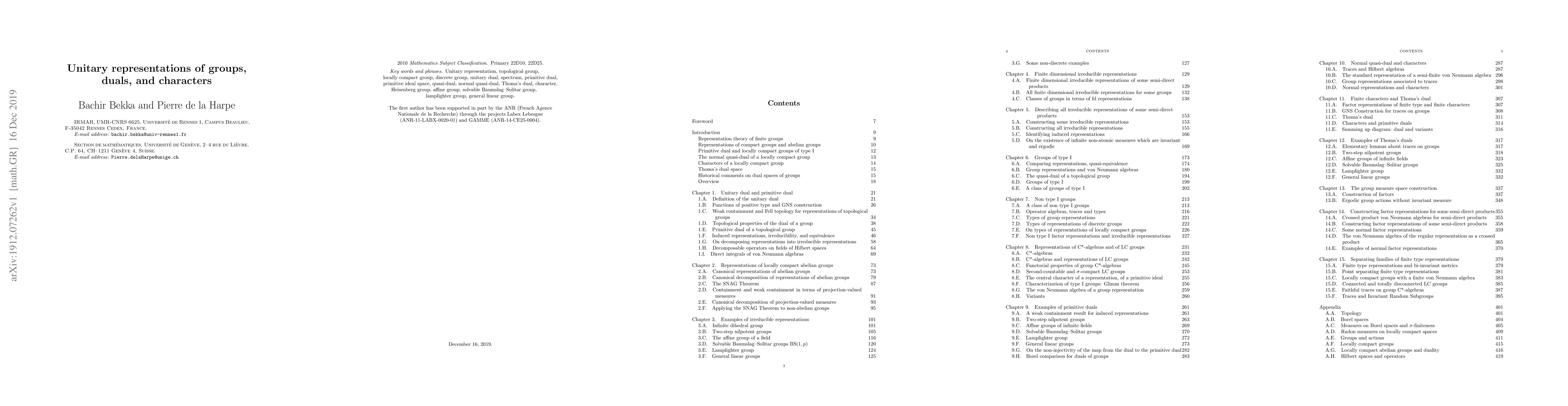 This book provides an overview of unitary representations of topological groups, focusing on their dual spaces and characters, with special emphasis on discrete groups. It explores the unitary dual, primitive dual, and normal quasi-dual, and uses examples like Heisenberg and affine groups to illustrate the theory, incorporating operator algebras like von Neumann and C*-algebras.
