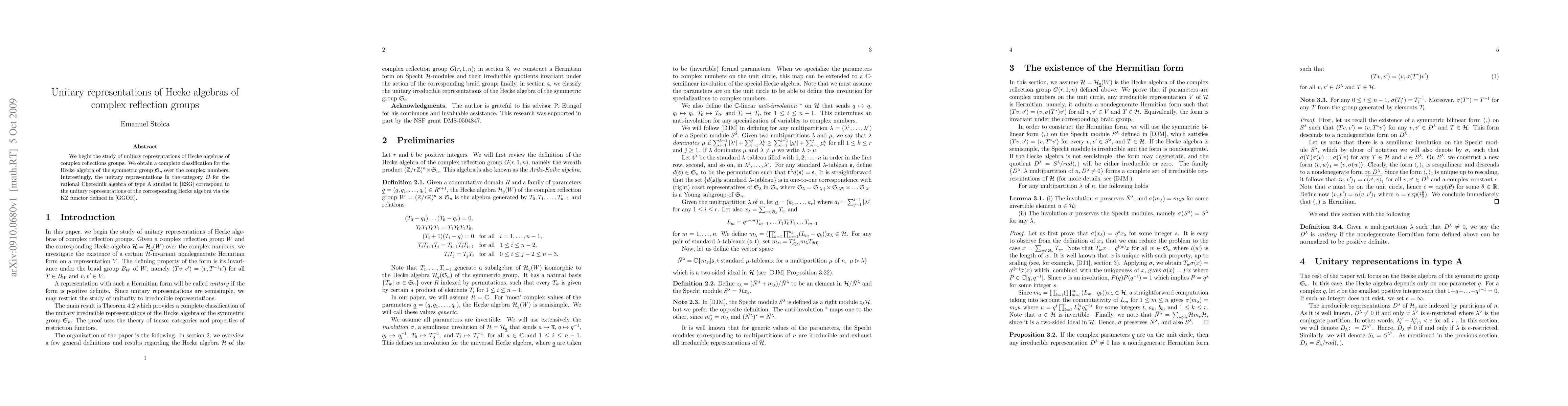 The paper provides a complete classification of unitary representations of Hecke algebras associated with complex reflection groups, specifically focusing on the symmetric group $\mathfrak{S}_n$. It establishes a connection between these representations and the rational Cherednik algebra of type A via the KZ functor.