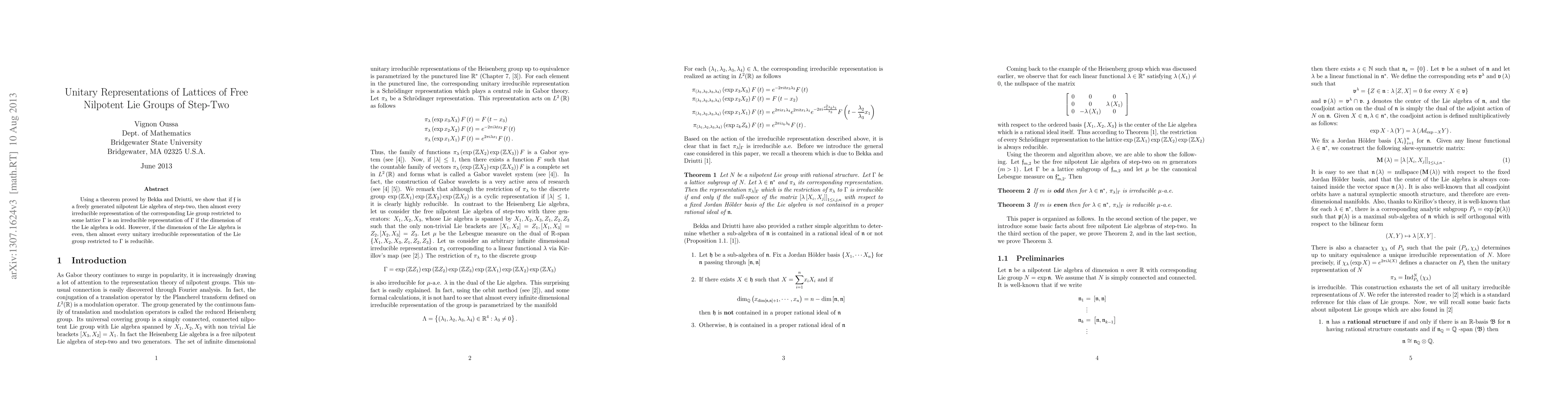 Using a theorem proved by Bekka and Driutti, we show that if $\mathfrak{f}$ is a freely generated nilpotent Lie algebra of step-two, then almost every irreducible representation of the corresponding Lie group restricted to some lattice $\Gamma$ is an irreducible representation of $\Gamma$ if the dimension of the Lie algebra is odd. However, if the dimension of the Lie algebra is even, then almost every unitary irreducible representation of the Lie group restricted to $\Gamma$ is reducible.