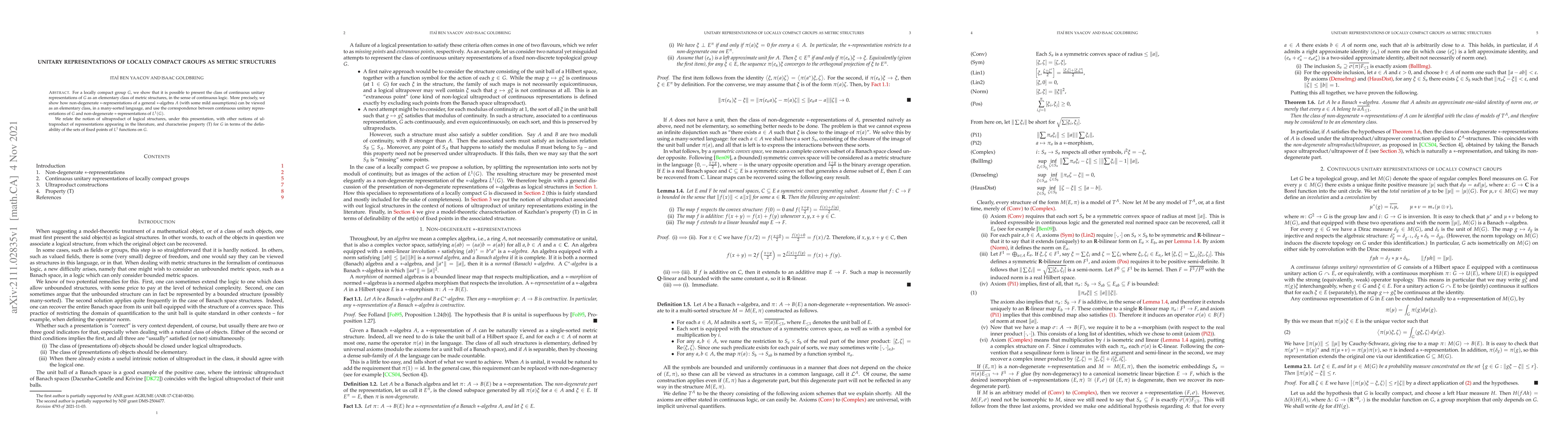 This paper presents locally compact groups' continuous unitary representations as an elementary class of metric structures in continuous logic, linking them to non-degenerate $*$-representations of $L^1(G)$ and discussing the characterization of property (T) via fixed points of $L^1$ functions.