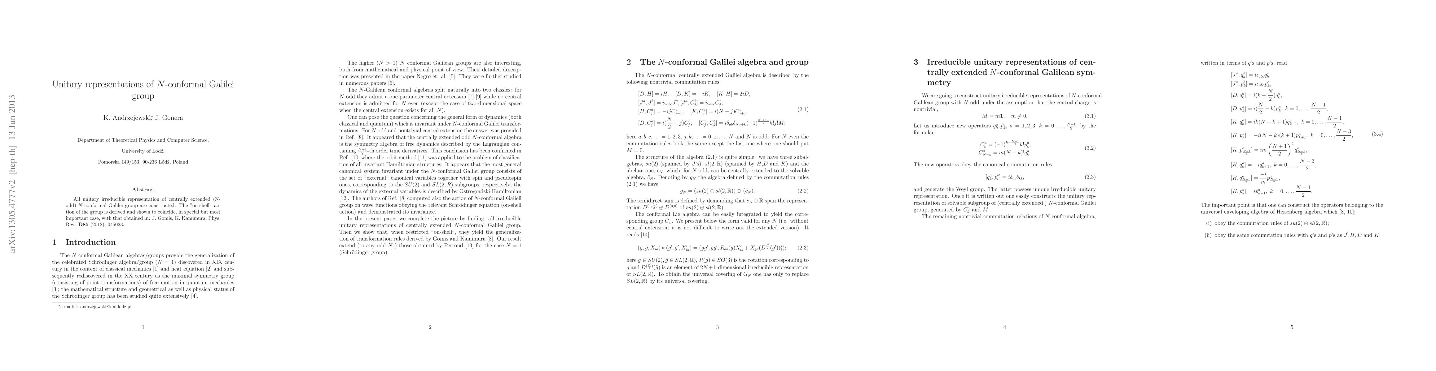 All unitary irreducible representations of centrally extended (N-odd) N-conformal Galilei group are constructed. The "on-shell" action of the group is derived and shown to coincide, in special but most important case, with that obtained in: J. Gomis, K. Kamimura, Phys. Rev. {\bf D85} (2012), 045023.