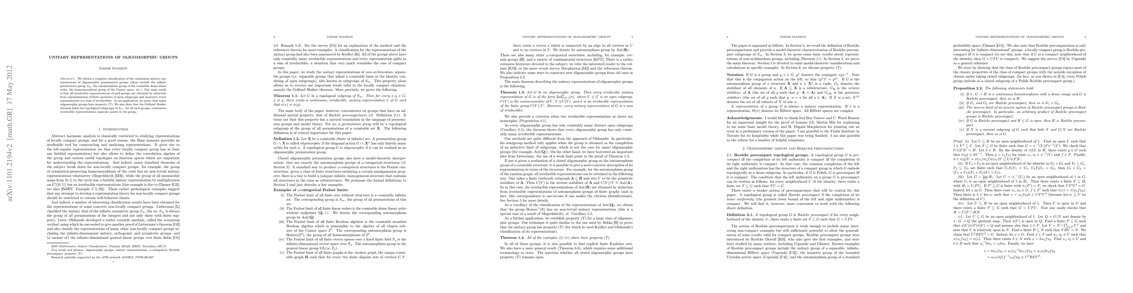 This paper classifies continuous unitary representations of oligomorphic groups, proving that all irreducible representations arise from finite quotients of open subgroups, and every representation is a sum of irreducibles. As a result, many oligomorphic groups exhibit property (T), and the Gelfand-Raikov theorem holds for topological subgroups of $S_\infty$.