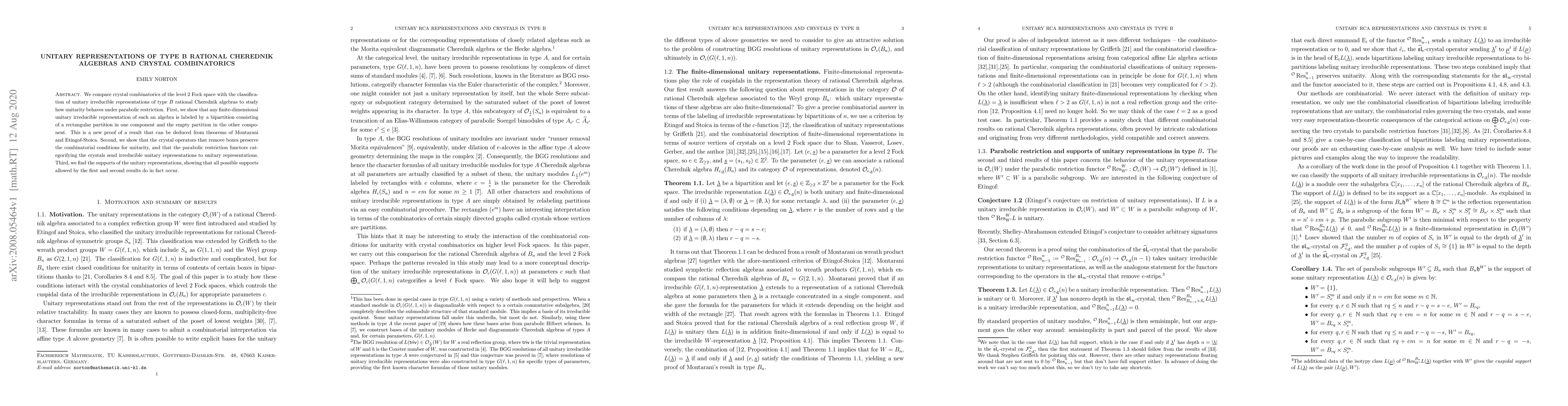 This paper studies the relationship between crystal combinatorics in the level 2 Fock space and unitary irreducible representations of type B rational Cherednik algebras, demonstrating that these representations are labeled by specific bipartitions. It also shows that crystal operators maintain unitarity conditions under parabolic restriction and identifies the supports of these unitary representations.