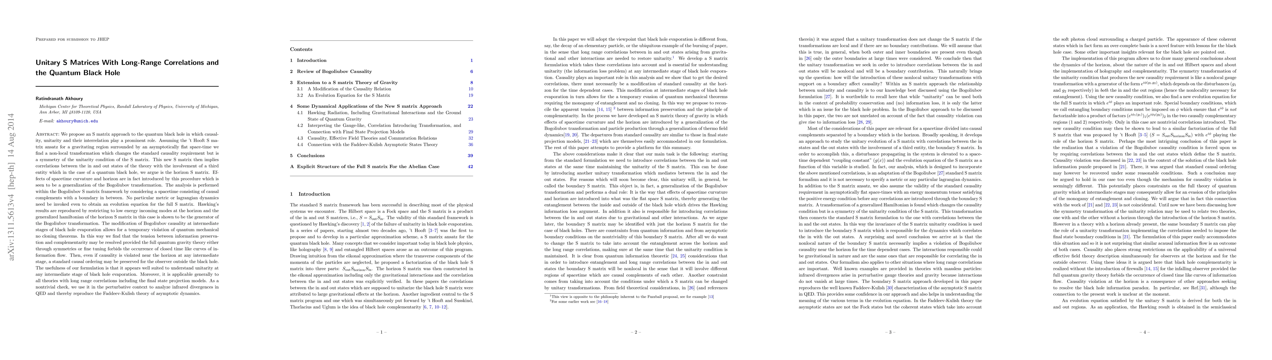 We propose an S matrix approach to the quantum black hole in which causality, unitarity and their interrelation play a prominent role. Assuming the 't Hooft S matrix ansatz for a gravitating region surrounded by an asymptotically flat space-time we find a non-local transformation which changes the standard causality requirement but is a symmetry of the unitarity condition of the S matrix. This new S matrix then implies correlations between the in and out states of the theory with the involvement of a third entity which in the case of a quantum black hole, we argue is the horizon S matrix. Such correlations are thus linked to preserving the unitarity of the S matrix and to the fact that entangling unitary operators are nonlocal. The analysis is performed within the Bogoliubov S matrix framework by considering a spacetime consisting of causal complements with a boundary in between. No particular metric or lagrangian dynamics need be invoked even to obtain an evolution equation for the full S matrix. Constraints imposed by the new causality requirement and implications for the effectiveness of field theoretical descriptions and for complementarity are also discussed. We find that the tension between information preservation and complementarity may be resolved provided the full quantum gravity theory either through symmetries or fine tuning forbids the occurrence of closed time like curves of information flow. Then, even if causality is violated near the horizon at any intermediate stage, a standard causal ordering may be preserved for the observer away from the horizon. In the context of the black hole, the novelty of our formulation is that it appears well suited to understand unitarity at any intermediate stage of black hole evaporation. Moreover, it is applicable generally to all theories with long range correlations including the final state projection models.