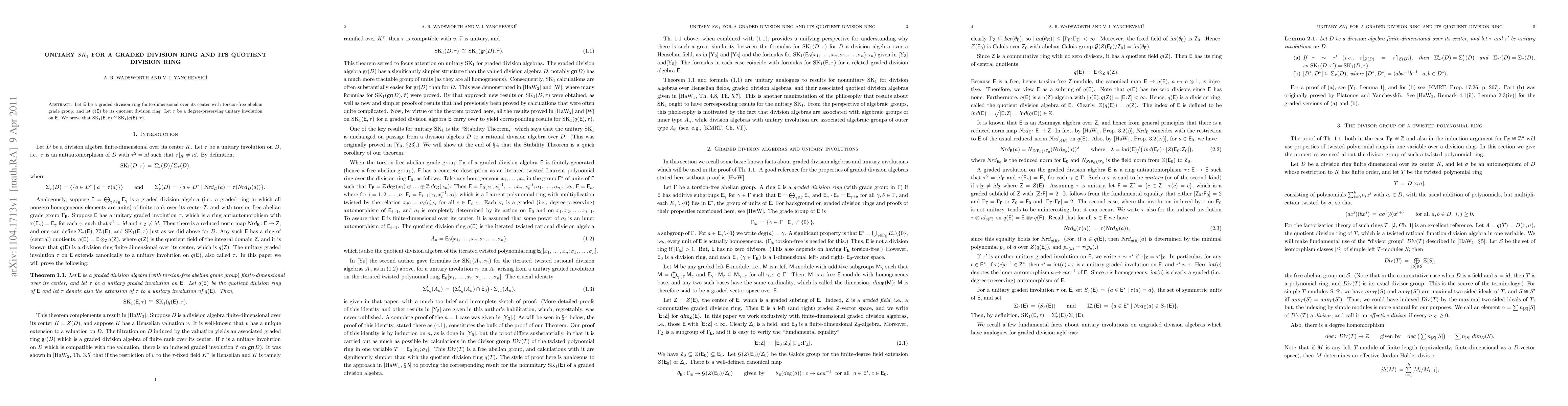 This paper proves that for a graded division ring E with a torsion-free abelian grade group and its quotient division ring q(E), the unitary K_1 groups SK_1(E, tau) and SK_1(q(E), tau) are isomorphic under a degree-preserving unitary involution tau.