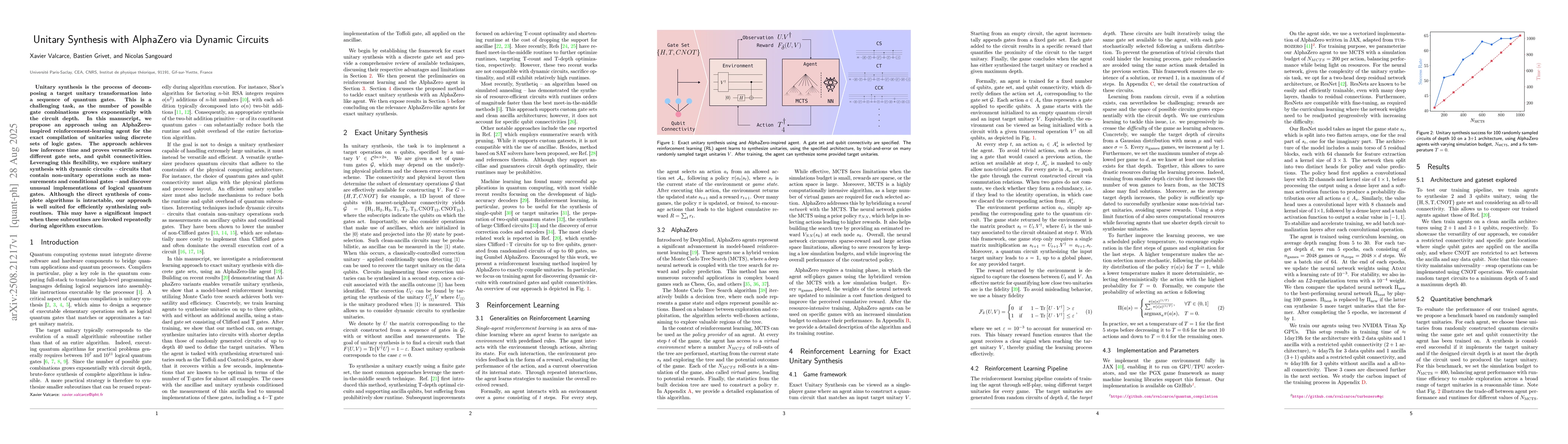 Unitary synthesis is the process of decomposing a target unitary transformation into a sequence of quantum gates. This is a challenging task, as the number of possible gate combinations grows exponentially with the circuit depth. In this manuscript, we propose an approach using an AlphaZero-inspired reinforcement-learning agent for the exact compilation of unitaries using discrete sets of logic gates. The approach achieves low inference time and proves versatile across different gate sets, and qubit connectivities. Leveraging this flexibility, we explore unitary synthesis with dynamic circuits -- circuits that contain non-unitary operations such as measurements and conditional gates -- and discover unusual implementations of logical quantum gates. Although the direct synthesis of complete algorithms is intractable, our approach is well suited for efficiently synthesizing subroutines. This may have a significant impact when these subroutines are invoked repeatedly during algorithm execution.