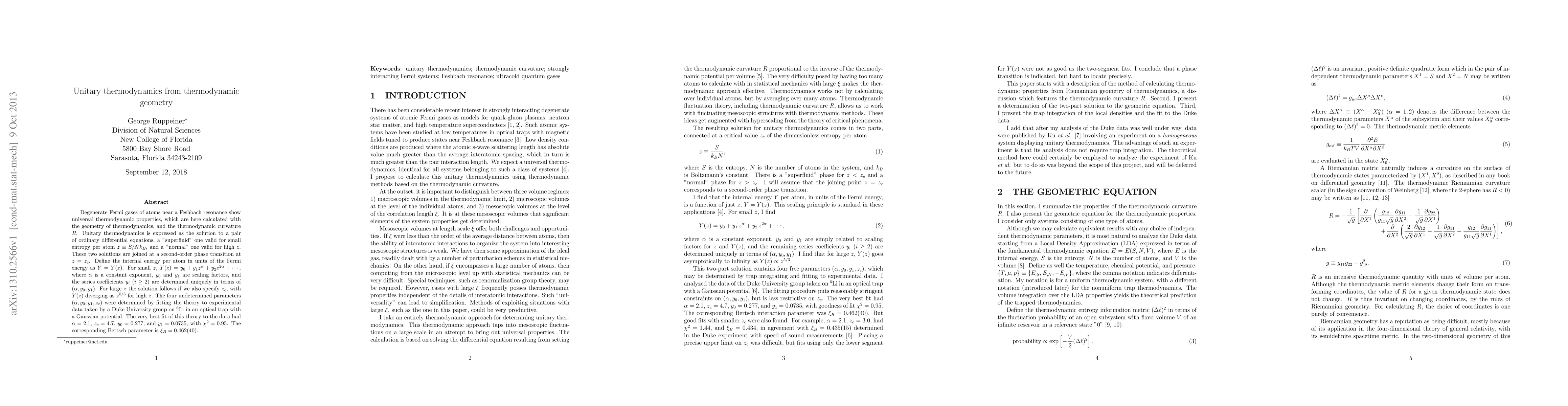 The paper introduces a new technique for unitary thermodynamics using thermodynamic geometry, providing a scaled fundamental equation for internal energy per atom in units of Fermi energy, Y(z), with z as entropy per atom in units of k_B.