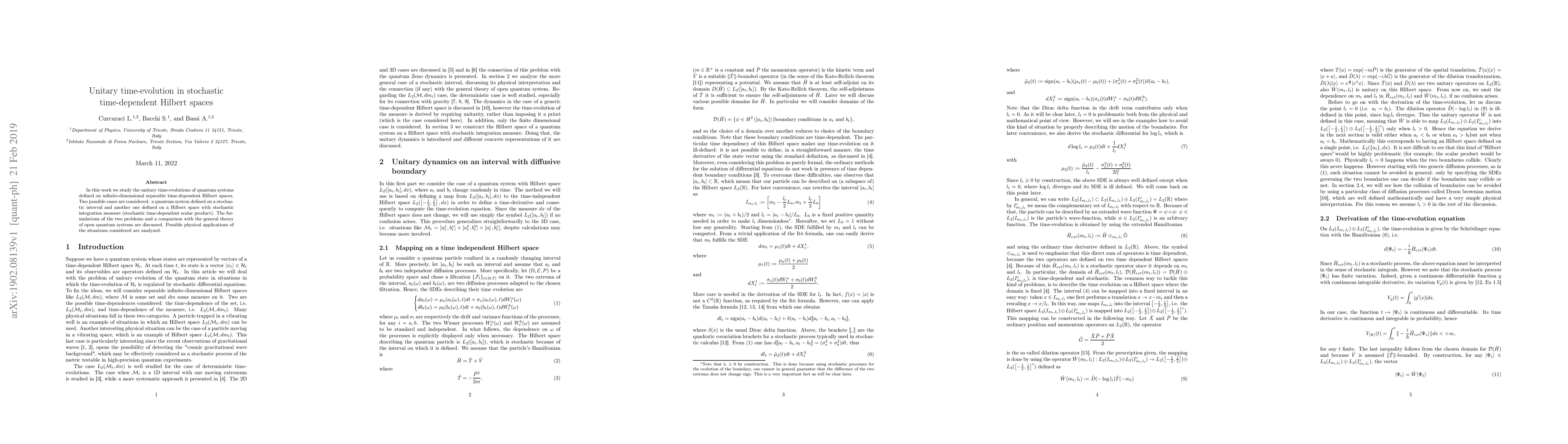 This paper explores unitary time-evolution in quantum systems on infinite-dimensional, time-dependent Hilbert spaces, considering stochastic intervals and stochastic integration measures. It compares these formulations with open quantum systems and discusses potential physical applications.