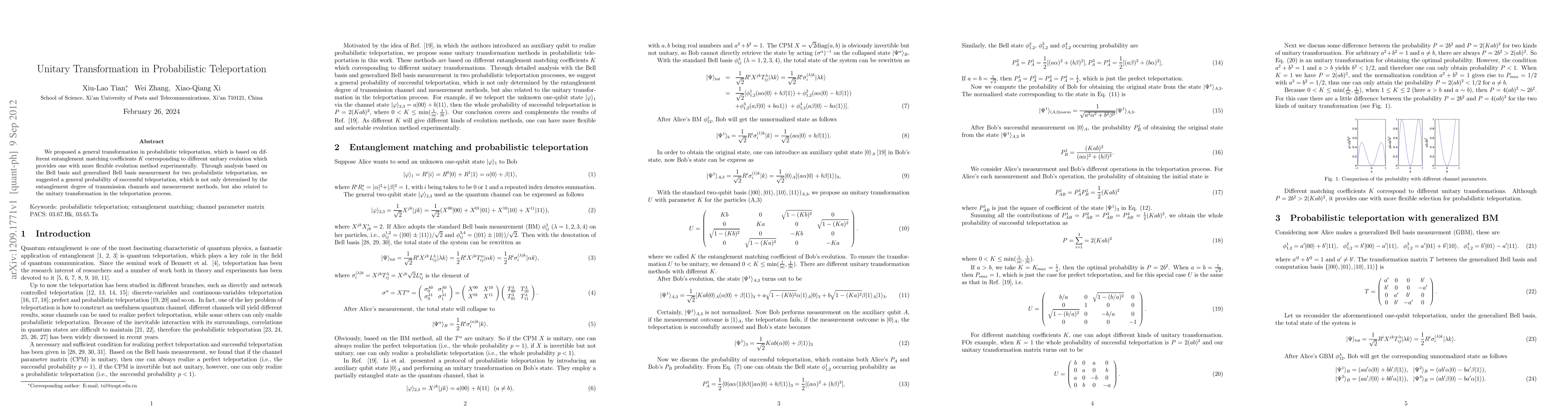 This paper proposes a new unitary transformation method for probabilistic teleportation, enhancing flexibility in experimental setups. It introduces different entanglement matching coefficients $K$ and analyzes the success probability of teleportation based on Bell and generalized Bell basis measurements, showing that the probability is influenced by both the entanglement degree and the chosen unitary transformation.