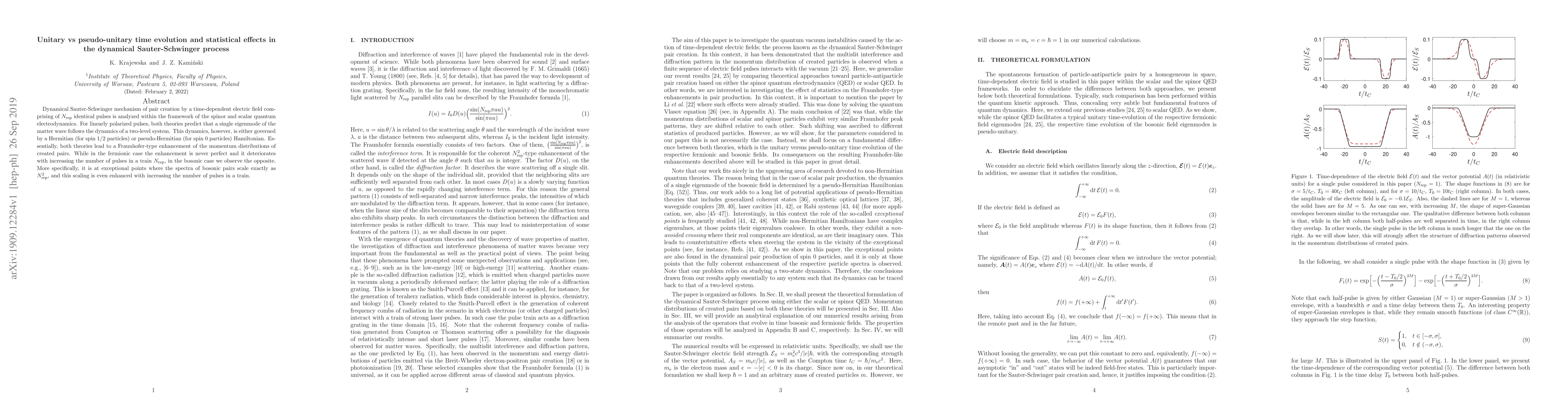 Dynamical Sauter-Schwinger mechanism of pair creation by a time-dependent electric field comprising of $N_{\rm rep}$ identical pulses is analyzed within the framework of the spinor and scalar quantum electrodynamics. For linearly polarized pulses, both theories predict that a single eigenmode of the matter wave follows the dynamics of a two-level system. This dynamics, however, is either governed by a Hermitian (for spin 1/2 particles) or pseudo-Hermitian (for spin 0 particles) Hamiltonian. Essentially, both theories lead to a Fraunhofer-type enhancement of the momentum distributions of created pairs. While in the fermionic case the enhancement is never perfect and it deteriorates with increasing the number of pulses in a train $N_{\rm rep}$, in the bosonic case we observe the opposite. More specifically, it is at exceptional points where the spectra of bosonic pairs scale exactly as $N_{\rm rep}^2$, and this scaling is even enhanced with increasing the number of pulses in a train.