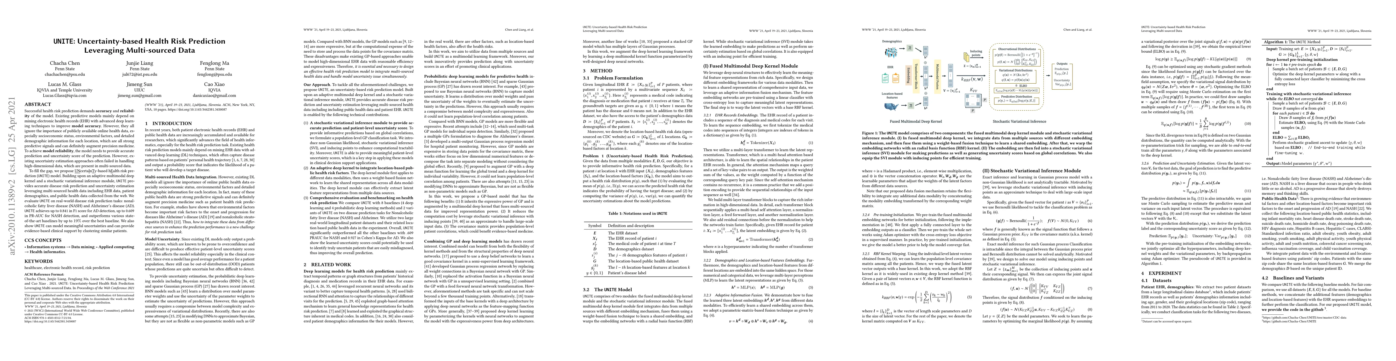 Successful health risk prediction demands accuracy and reliability of the model. Existing predictive models mainly depend on mining electronic health records (EHR) with advanced deep learning techniques to improve model accuracy. However, they all ignore the importance of publicly available online health data, especially socioeconomic status, environmental factors, and detailed demographic information for each location, which are all strong predictive signals and can definitely augment precision medicine. To achieve model reliability, the model needs to provide accurate prediction and uncertainty score of the prediction. However, existing uncertainty estimation approaches often failed in handling high-dimensional data, which are present in multi-sourced data. To fill the gap, we propose UNcertaInTy-based hEalth risk prediction (UNITE) model. Building upon an adaptive multimodal deep kernel and a stochastic variational inference module, UNITE provides accurate disease risk prediction and uncertainty estimation leveraging multi-sourced health data including EHR data, patient demographics, and public health data collected from the web. We evaluate UNITE on real-world disease risk prediction tasks: nonalcoholic fatty liver disease (NASH) and Alzheimer's disease (AD). UNITE achieves up to 0.841 in F1 score for AD detection, up to 0.609 in PR-AUC for NASH detection, and outperforms various state-of-the-art baselines by up to $19\%$ over the best baseline. We also show UNITE can model meaningful uncertainties and can provide evidence-based clinical support by clustering similar patients.