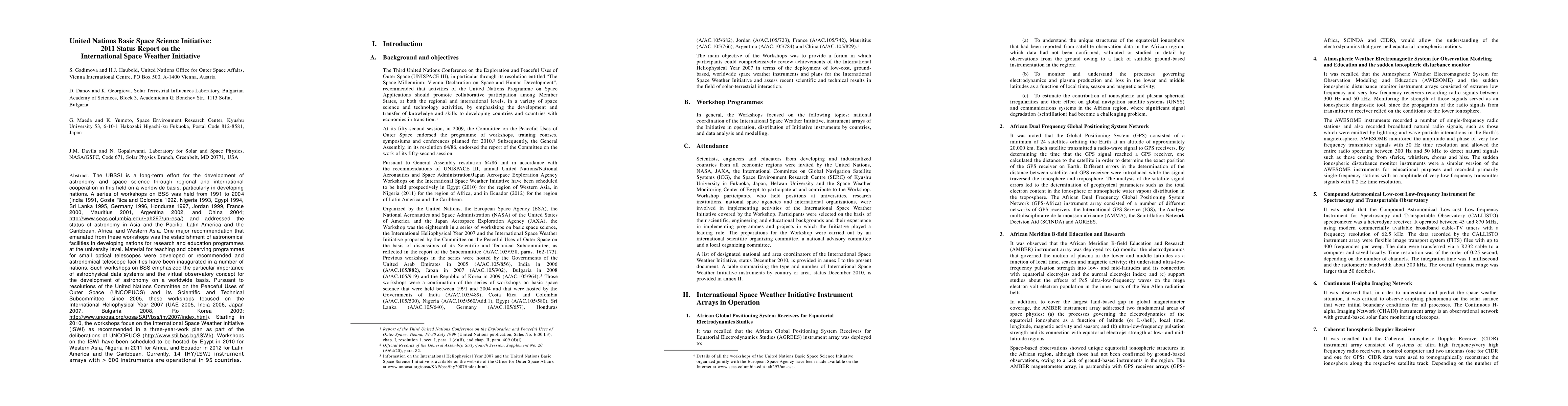The UNBSSI is a long-term effort for the development of astronomy and space science through regional and international cooperation in this field on a worldwide basis. A series of workshops on BSS was held from 1991 to 2004 (India 1991, Costa Rica and Colombia 1992, Nigeria 1993, Egypt 1994, Sri Lanka 1995, Germany 1996, Honduras 1997, Jordan 1999, France 2000, Mauritius 2001, Argentina 2002, and China 2004; http://www.seas.columbia.edu/~ah297/un-esa/) and addressed the status of astronomy in Asia and the Pacific, Latin America and the Caribbean, Africa, and Western Asia. One major recommendation that emanated from these workshops was the establishment of astronomical facilities in developing nations for research and education programmes at the university level. Such workshops on BSS emphasized the particular importance of astrophysical data systems and the virtual observatory concept for the development of astronomy on a worldwide basis. Pursuant to resolutions of the United Nations Committee on the Peaceful Uses of Outer Space (UNCOPUOS) and its Scientific and Technical Subcommittee, since 2005, these workshops focused on the International Heliophysical Year 2007 (UAE 2005, India 2006, Japan 2007, Bulgaria 2008, Ro Korea 2009; http://www.unoosa.org/oosa/SAP/bss/ihy2007/index.html). Starting in 2010, the workshops focus on the International Space Weather Initiative (ISWI) as recommended in a three-year-work plan as part of the deliberations of UNCOPUOS (http://www.stil.bas.bg/ISWI/). Workshops on the ISWI have been scheduled to be hosted by Egypt in 2010 for Western Asia, Nigeria in 2011 for Africa, and Ecuador in 2012 for Latin America and the Caribbean. Currently, 14 IHY/ISWI instrument arrays with > 600 instruments are operational in 95 countries.