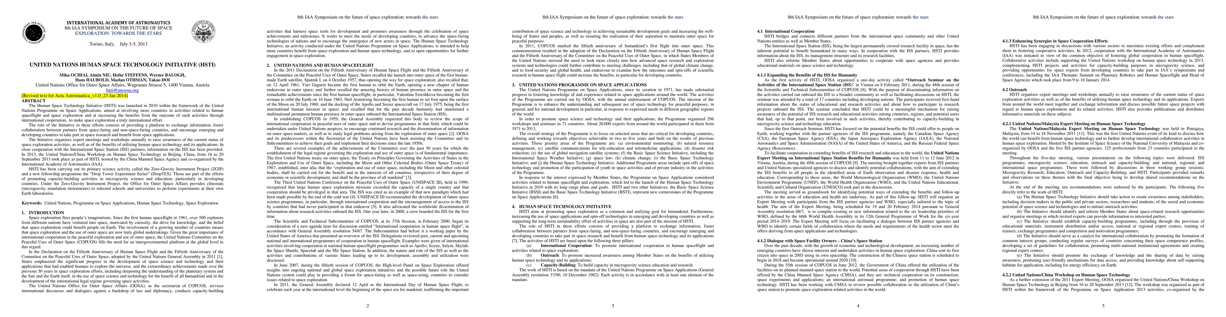 The United Nations Human Space Technology Initiative (HSTI) aims to promote international cooperation in human spaceflight and space exploration, providing a platform for information exchange and collaboration, while encouraging emerging countries to engage in space research and benefit from its applications. The Initiative conducts workshops and primary science projects to enhance microgravity science and education, particularly in developing nations.