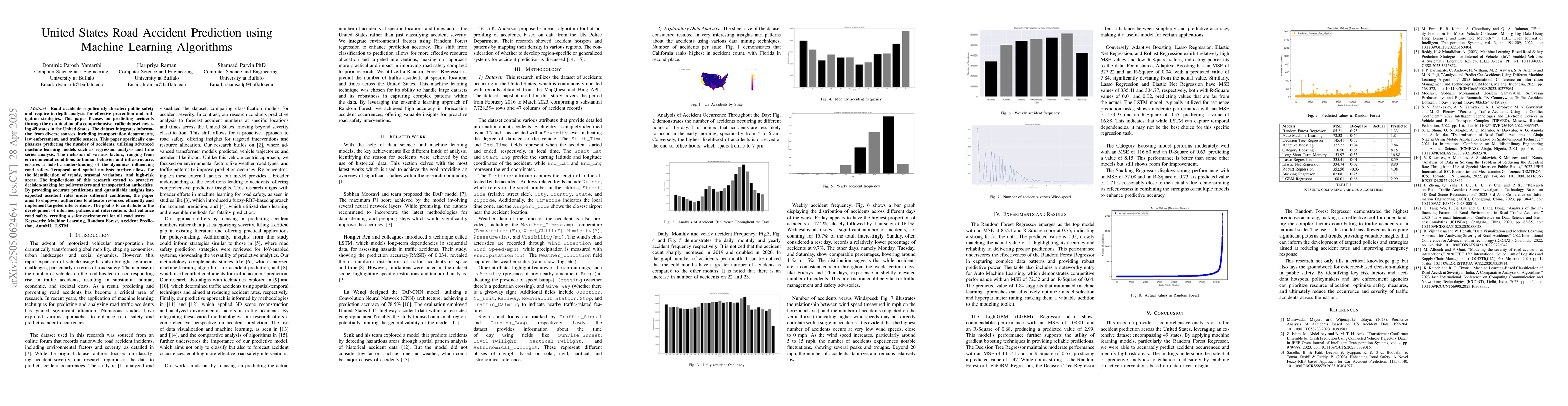 Road accidents significantly threaten public safety and require in-depth analysis for effective prevention and mitigation strategies. This paper focuses on predicting accidents through the examination of a comprehensive traffic dataset covering 49 states in the United States. The dataset integrates information from diverse sources, including transportation departments, law enforcement, and traffic sensors. This paper specifically emphasizes predicting the number of accidents, utilizing advanced machine learning models such as regression analysis and time series analysis. The inclusion of various factors, ranging from environmental conditions to human behavior and infrastructure, ensures a holistic understanding of the dynamics influencing road safety. Temporal and spatial analysis further allows for the identification of trends, seasonal variations, and high-risk areas. The implications of this research extend to proactive decision-making for policymakers and transportation authorities. By providing accurate predictions and quantifiable insights into expected accident rates under different conditions, the paper aims to empower authorities to allocate resources efficiently and implement targeted interventions. The goal is to contribute to the development of informed policies and interventions that enhance road safety, creating a safer environment for all road users. Keywords: Machine Learning, Random Forest, Accident Prediction, AutoML, LSTM.