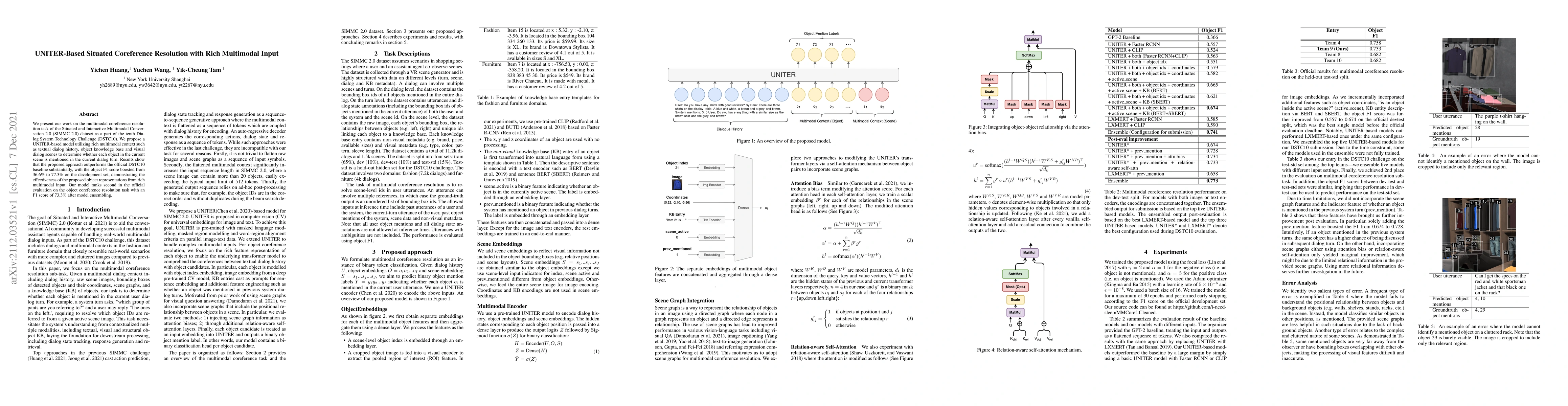 This paper proposes a UNITER-based model for multimodal coreference resolution using rich inputs like textual dialog history, object knowledge, and visual scenes, achieving a significant improvement in object F1 score from 36.6% to 77.3% on the DSTC10 development set, and ranking second in the official evaluation.