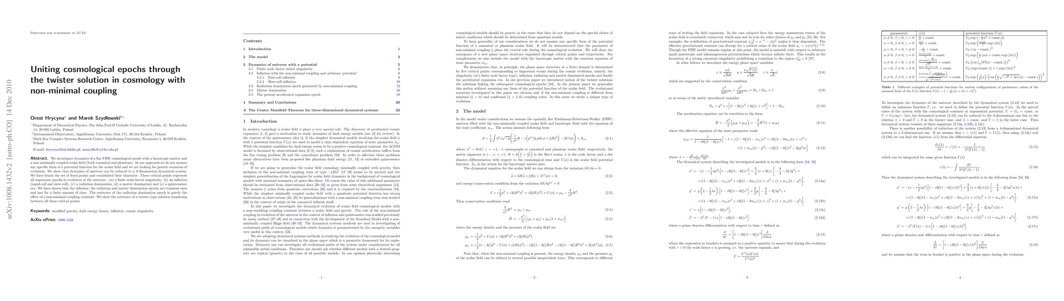 We investigate dynamics of a flat FRW cosmological model with a barotropic matter and a non-minimally coupled scalar field (both canonical and phantom). In our approach we do not assume any specific form of a potential function for the scalar field and we are looking for generic scenarios of evolution. We show that dynamics of universe can be reduced to a 3-dimensional dynamical system. We have found the set of fixed points and established their character. These critical points represent all important epochs in evolution of the universe : (a) a finite scale factor singularity, (b) an inflation (rapid-roll and slow-roll), (c) a radiation domination, (d) a matter domination and (e) a quintessence era. We have shown that the inflation, the radiation and matter domination epochs are transient ones and last for a finite amount of time. The existence of the radiation domination epoch is purely the effect of a non-minimal coupling constant. We show the existence of a twister type solution wandering between all these critical points.