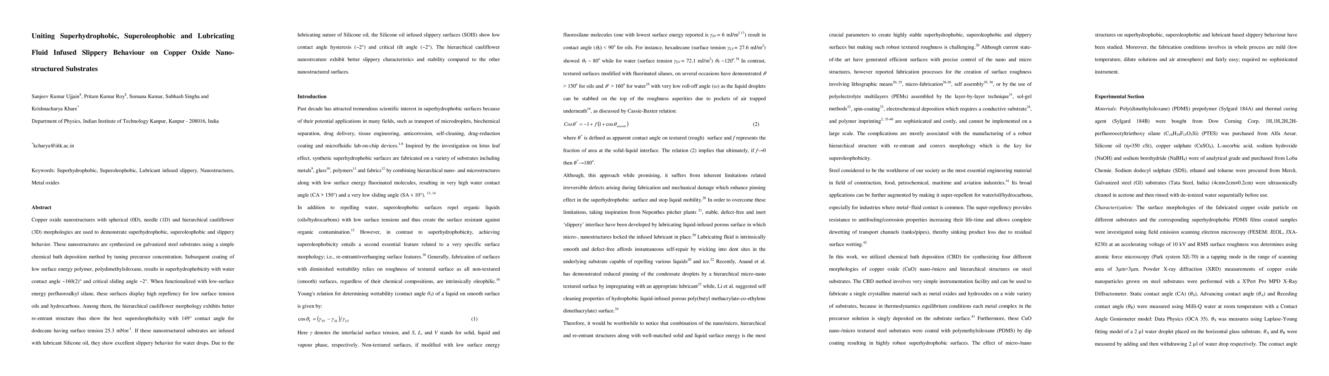 This study synthesizes copper oxide nanostructures with various morphologies on galvanized steel substrates, achieving superhydrophobic, superoleophobic, and slippery behavior through chemical bath deposition and coating with polydimethylsiloxane and perfluoroalkyl silane. The hierarchical cauliflower morphology shows the best superoleophobicity and stability when infused with silicone oil, demonstrating excellent slippery behavior.