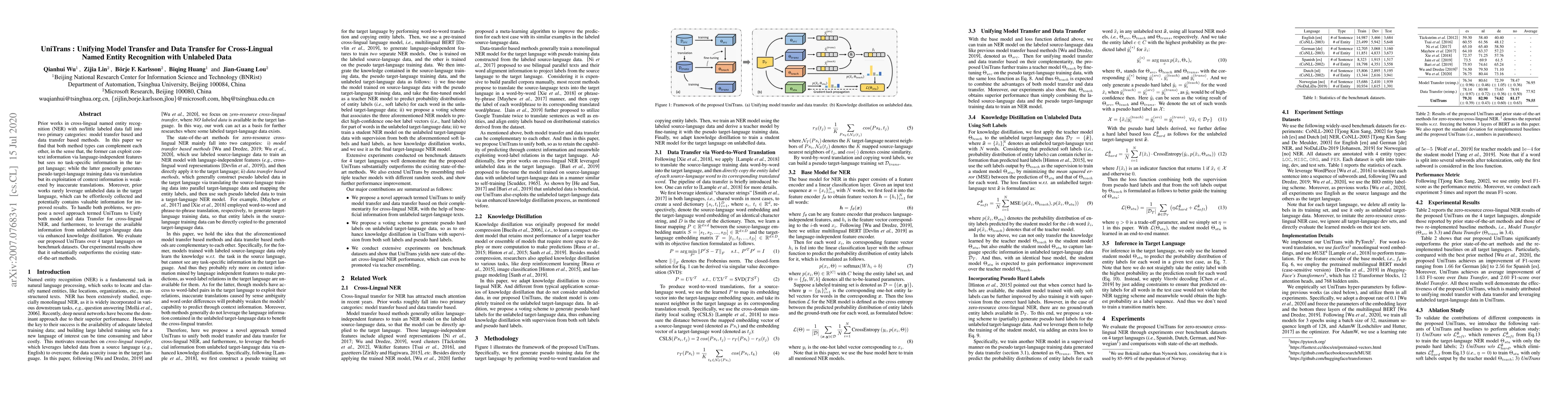 UniTrans unifies model transfer and data transfer methods to enhance cross-lingual named entity recognition using unlabeled target-language data, achieving superior performance over existing state-of-the-art techniques. The approach leverages language-independent features and improved knowledge distillation for better context exploitation.