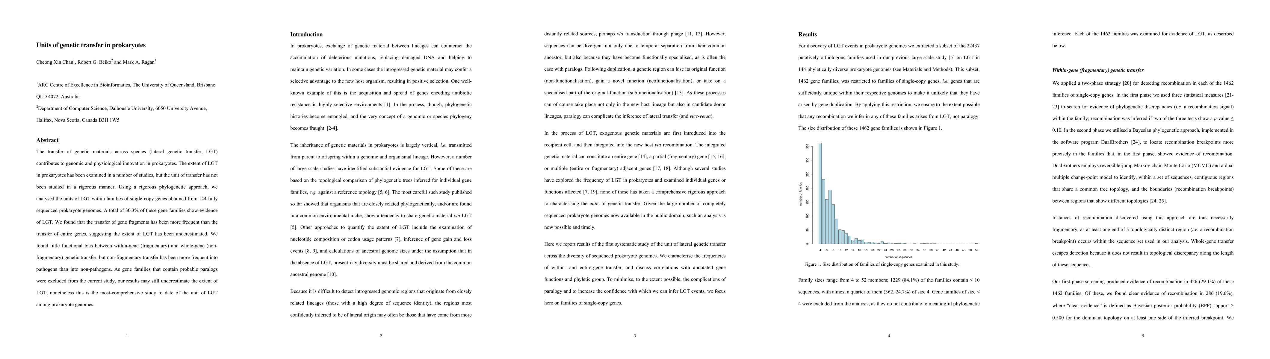 The transfer of genetic materials across species (lateral genetic transfer, LGT) contributes to genomic and physiological innovation in prokaryotes. The extent of LGT in prokaryotes has been examined in a number of studies, but the unit of transfer has not been studied in a rigorous manner. Using a rigorous phylogenetic approach, we analysed the units of LGT within families of single-copy genes obtained from 144 fully sequenced prokaryote genomes. A total of 30.3% of these gene families show evidence of LGT. We found that the transfer of gene fragments has been more frequent than the transfer of entire genes, suggesting the extent of LGT has been underestimated. We found little functional bias between within-gene (fragmentary) and whole-gene (non-fragmentary) genetic transfer, but non-fragmentary transfer has been more frequent into pathogens than into non-pathogens. As gene families that contain probable paralogs were excluded from the current study, our results may still underestimate the extent of LGT; nonetheless this is the most-comprehensive study to date of the unit of LGT among prokaryote genomes.