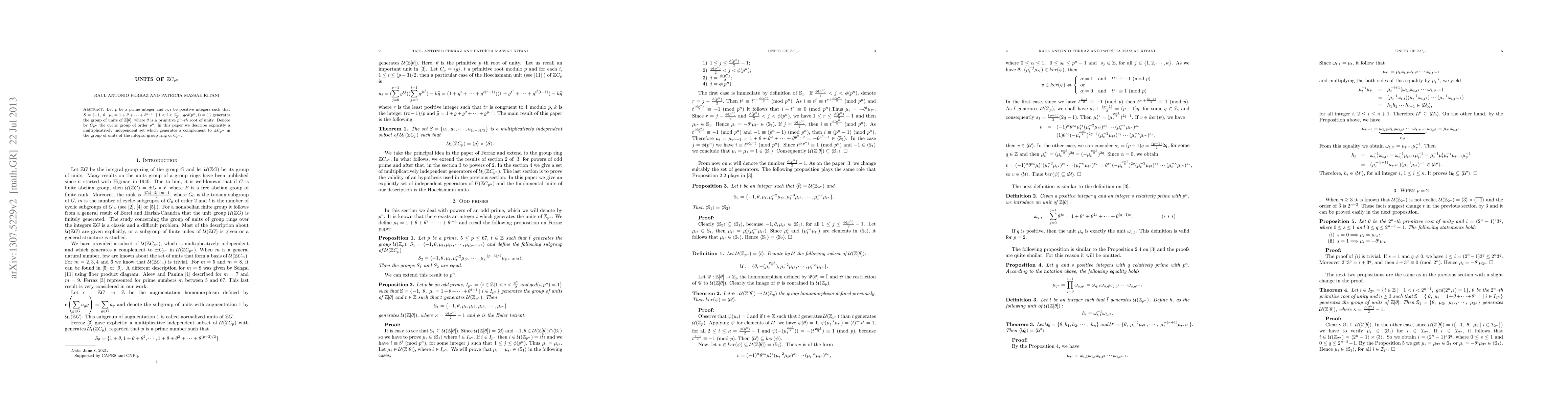 This paper explores the structure of the group of units in the integral group ring of the cyclic group $C_{p^n}$, identifying a multiplicatively independent set that generates a complement to $\pm C_{p^n}$. It explicitly describes the generating set $S$ for the group $\mathbb{Z}[\theta]$ where $\theta$ is a primitive $p^n$-th root of unity.