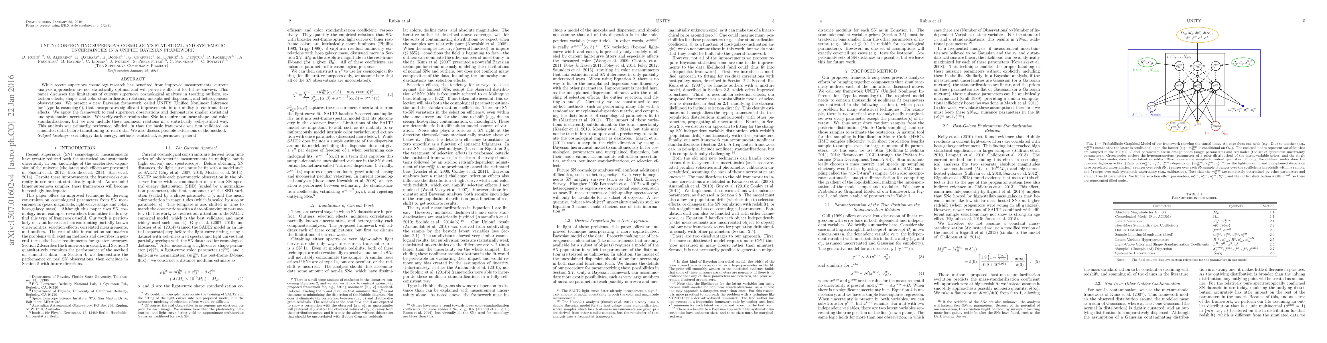 This paper introduces UNITY, a new Bayesian framework to improve supernova cosmology analyses, addressing statistical and systematic uncertainties by better handling outliers, selection effects, and observational heterogeneities. The method shows reduced uncertainties when applied to real supernova data, validated first on simulated data.