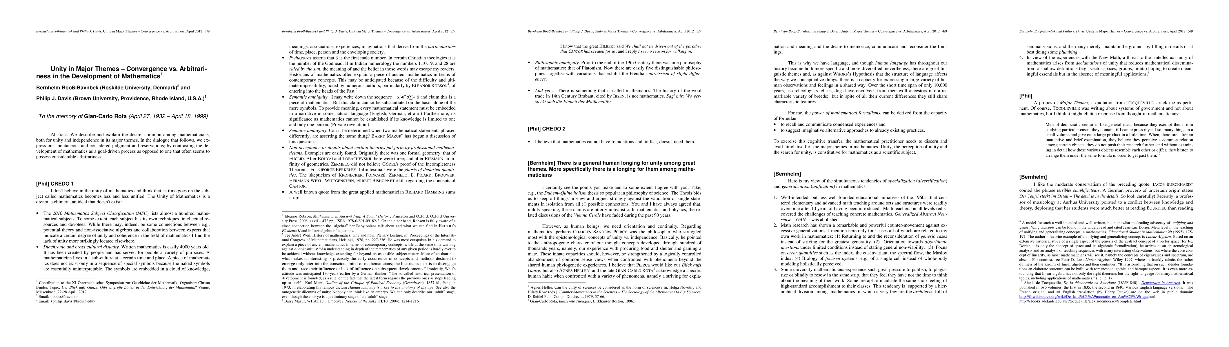 We describe and explain the desire, common among mathematicians, both for unity and independence in its major themes. In the dialogue that follows, we express our spontaneous and considered judgment and reservations by contrasting the development of mathematics as a goal-driven process as opposed to one that often seems to possess considerable arbitrariness.