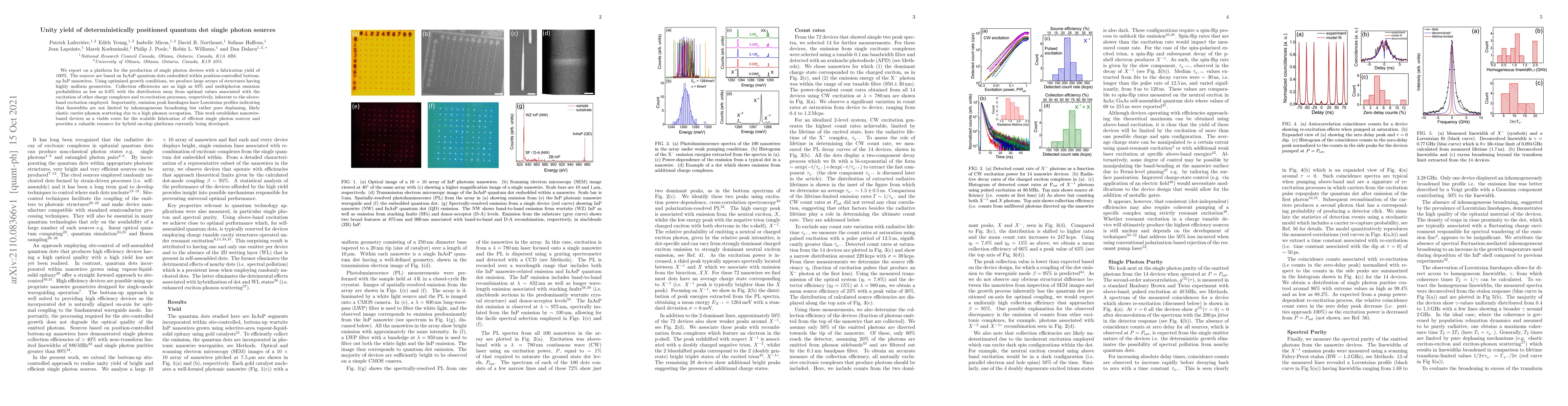 This paper presents a platform for creating single photon sources with a 100% fabrication yield using InAsP quantum dots embedded in InP nanowires, achieving high collection efficiencies and low multiphoton emission probabilities. The Lorentzian emission peak profiles suggest that linewidths are limited by pure dephasing rather than inhomogeneous broadening.