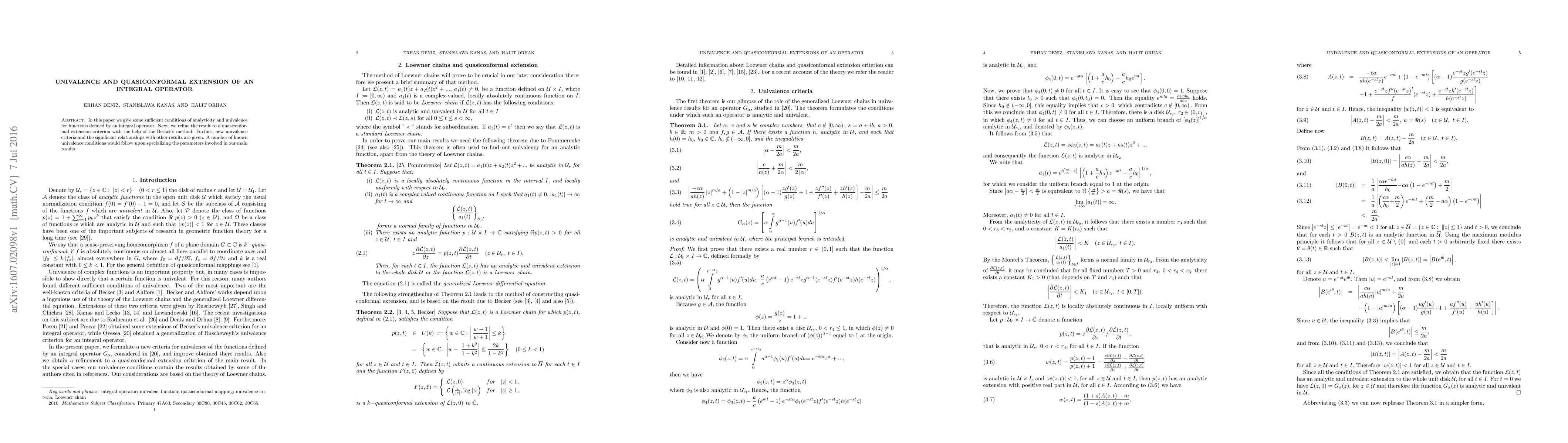 This paper establishes sufficient conditions for the analyticity and univalence of functions defined by an integral operator. It then extends these results to quasiconformal criteria using Becker's method, providing new univalence criteria and connections to existing literature.
