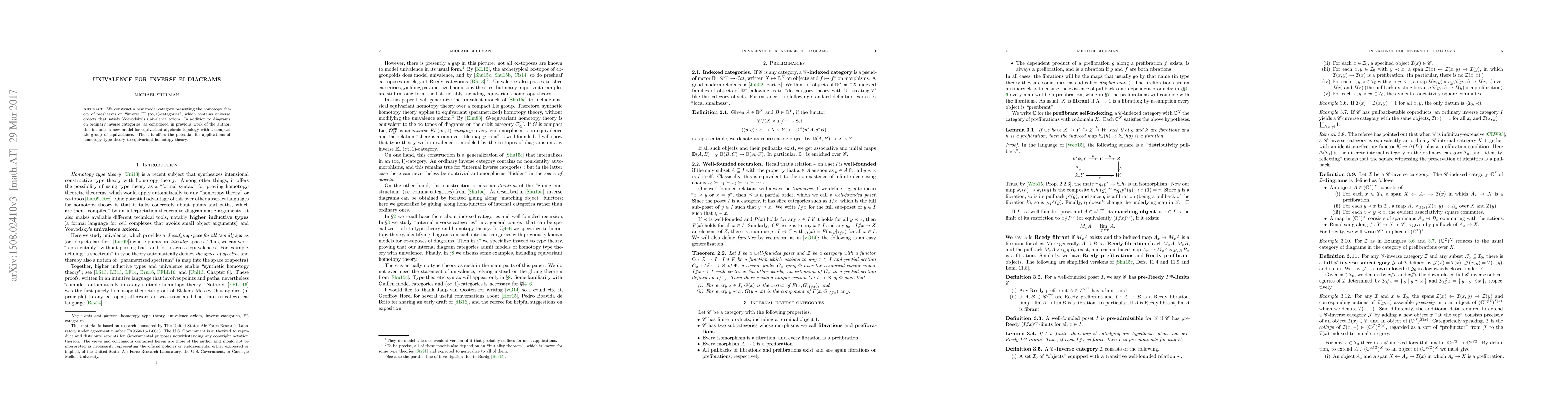 This paper constructs a new model category for presheaves on inverse EI $(\infty,1)$-categories, incorporating universe objects that satisfy Voevodsky's univalence axiom, and extends previous work to include equivariant algebraic topology with compact Lie group equivariance, promising applications to homotopy type theory.