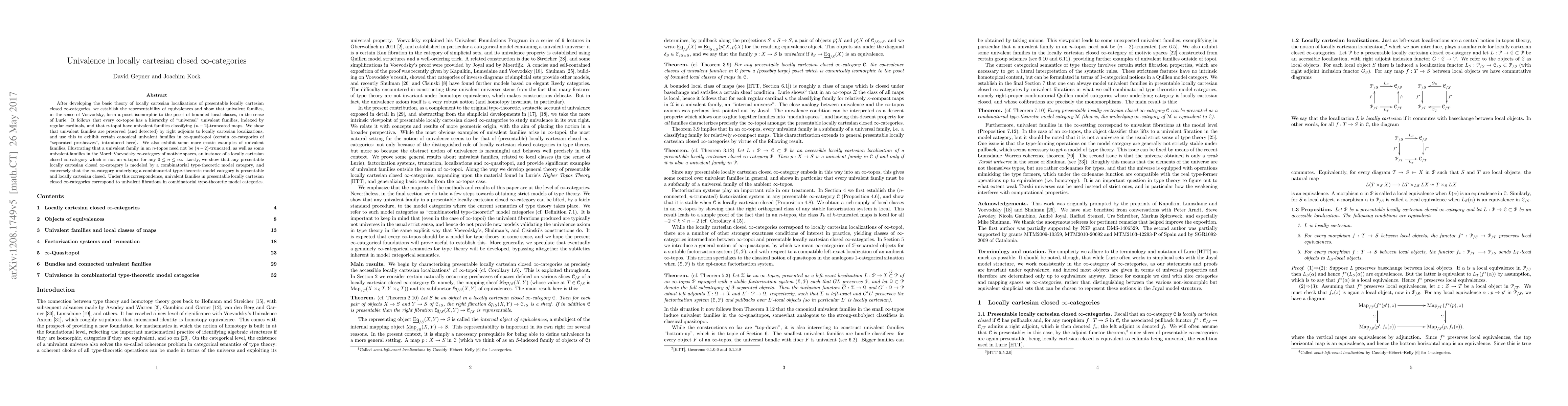 After developing the basic theory of locally cartesian localizations of presentable locally cartesian closed infinity-categories, we establish the representability of equivalences and show that univalent families, in the sense of Voevodsky, form a poset isomorphic to the poset of bounded local classes, in the sense of Lurie. It follows that every infinity-topos has a hierarchy of "universal" univalent families, indexed by regular cardinals, and that n-topoi have univalent families classifying (n-2)-truncated maps. We show that univalent families are preserved (and detected) by right adjoints to locally cartesian localizations, and use this to exhibit certain canonical univalent families in infinity-quasitopoi (certain infinity-categories of "separated presheaves", introduced here). We also exhibit some more exotic examples of univalent families, illustrating that a univalent family in an n-topos need not be (n-2)-truncated, as well as some univalent families in the Morel--Voevodsky infinity-category of motivic spaces, an instance of a locally cartesian closed infinity-category which is not an n-topos for any $0\leq n\leq\infty$. Lastly, we show that any presentable locally cartesian closed infinity-category is modeled by a combinatorial type-theoretic model category, and conversely that the infinity-category underlying a combinatorial type-theoretic model category is presentable and locally cartesian closed. Under this correspondence, univalent families in presentable locally cartesian closed infinity-categories correspond to univalent fibrations in combinatorial type-theoretic model categories.