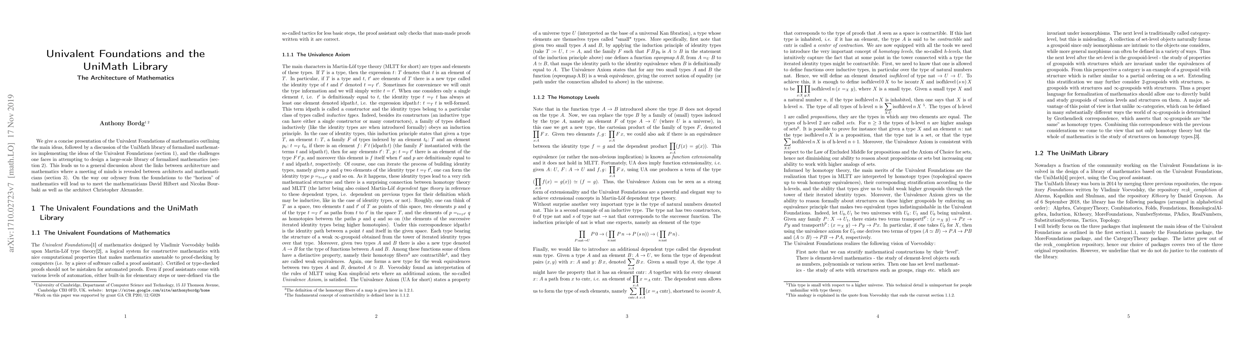 The paper introduces Univalent Foundations as a new approach to mathematics, followed by an overview of the UniMath library that formalizes these ideas. It discusses the challenges in creating a large-scale library and explores the connections between architectural and mathematical thought.