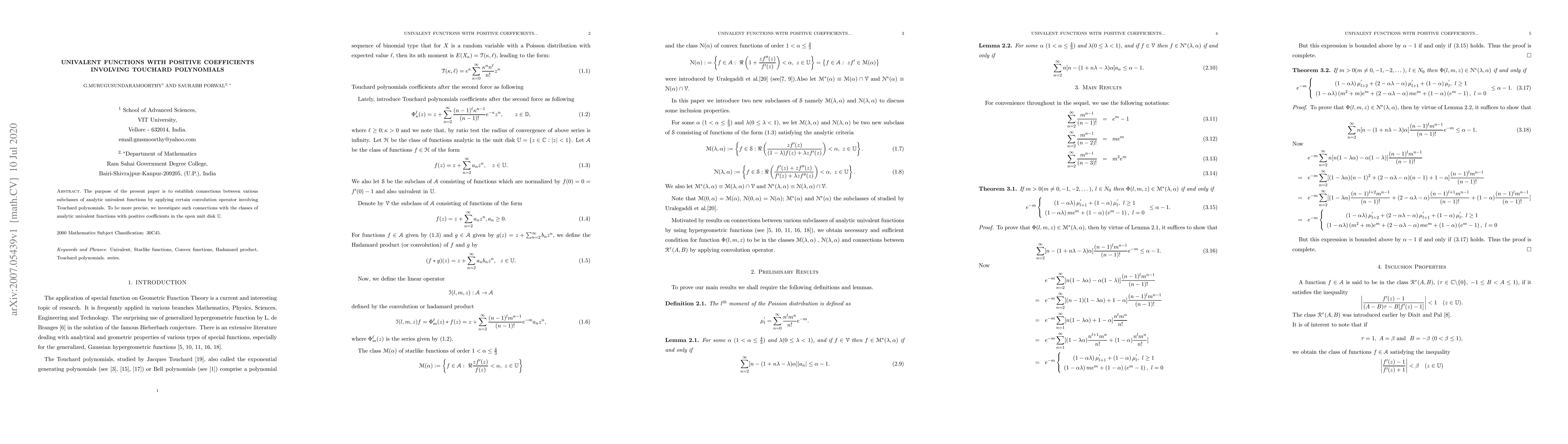 The research establishes connections between subclasses of analytic univalent functions using a convolution operator involving Touchard polynomials, focusing on functions with positive coefficients in the open unit disk U.