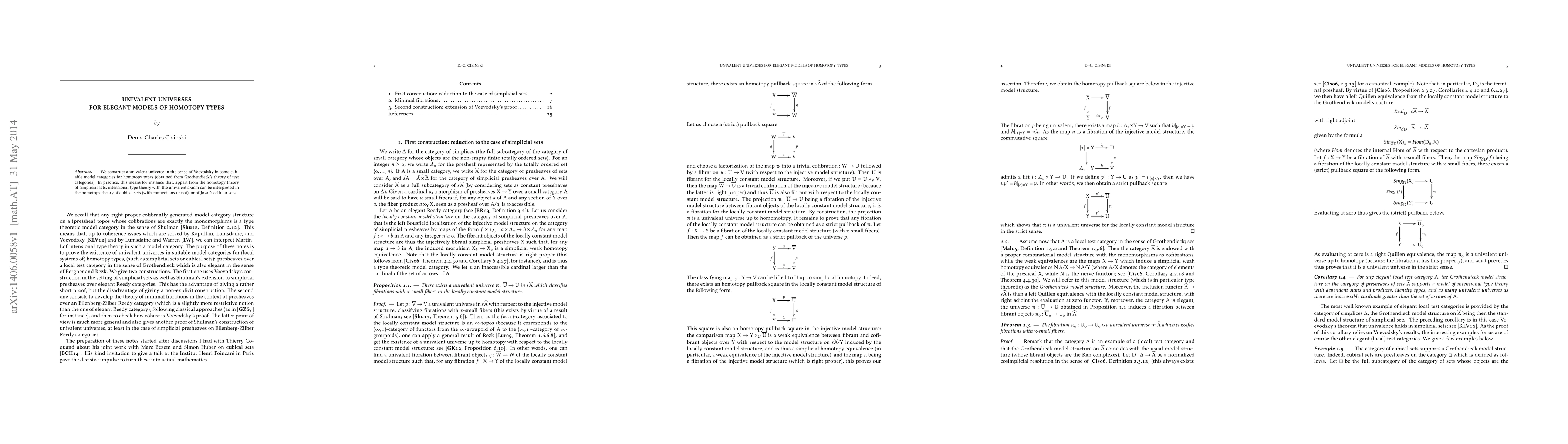 The paper constructs a univalent universe within model categories for homotopy types derived from Grothendieck's test categories, enabling interpretations of intensional type theory with the univalent axiom in the homotopy theories of simplicial, cubical, and Joyal's cellular sets. This approach facilitates elegant models of homotopy types through these frameworks.
